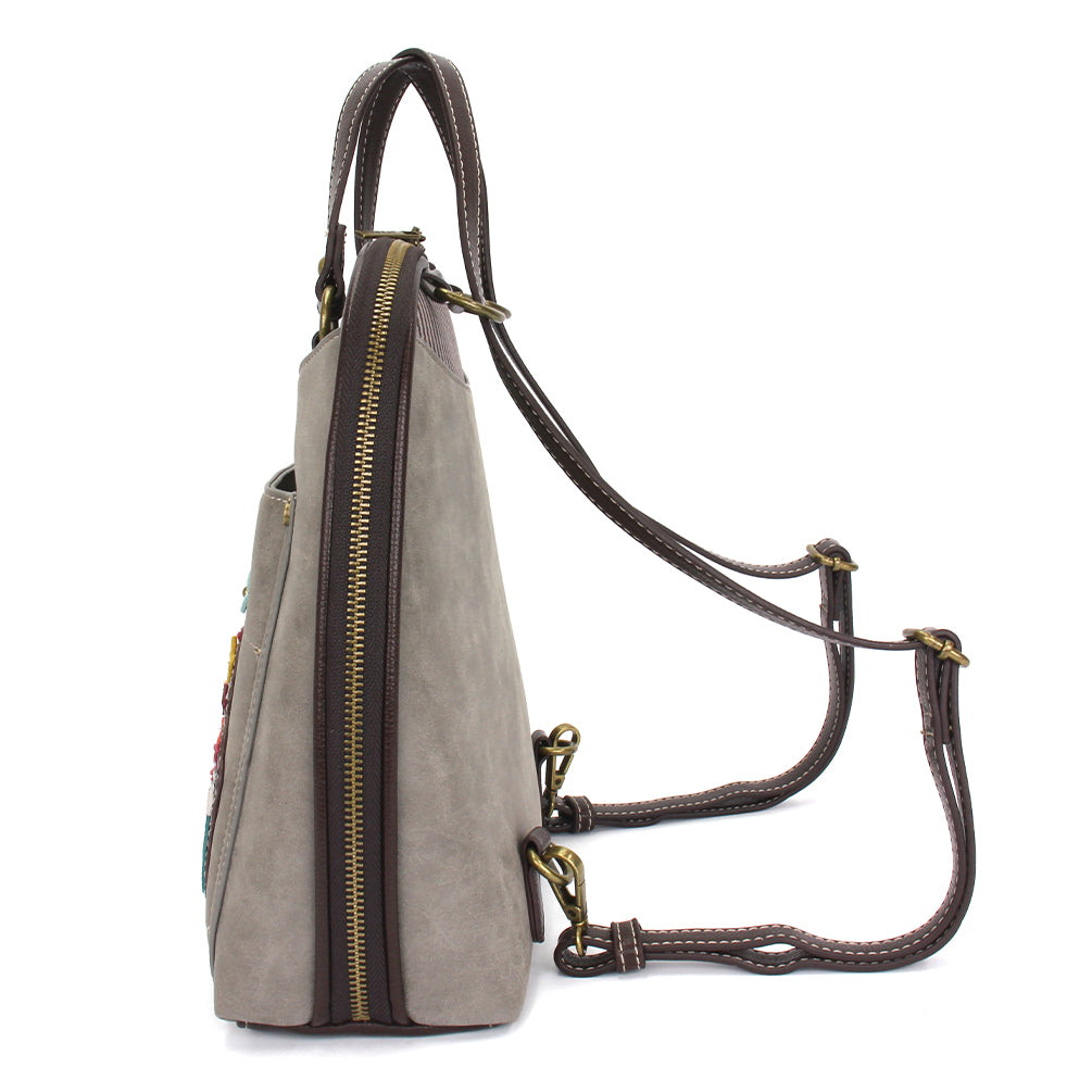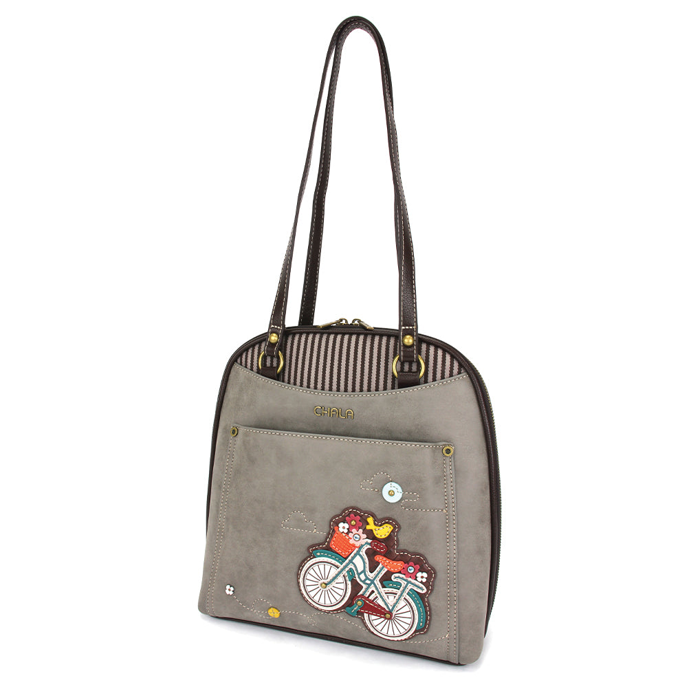 Roomy, Versatile, and FunAdorned with Bicycle Chala Pal designDual strap configurations - can be worn as a Backpack or Shoulder Bag by converting strapsMain compartment features multiple pockets for storage Wide mouth zipper opening for easy access to belongingsFront zipper pocketFront slide pocketAdjustable strapsMaterials: Faux Leather / Cotton CanvasColor: GrayApprox. Measurements: 9.5"W x 10"H x 3.5"DStrap adjustable: 6"-15"Designed in California, USAMade in ChinaColors may not be exactly as shown.Lining patterns may vary.