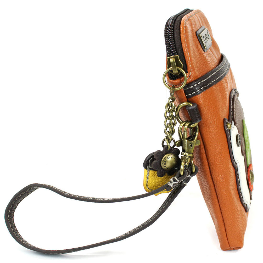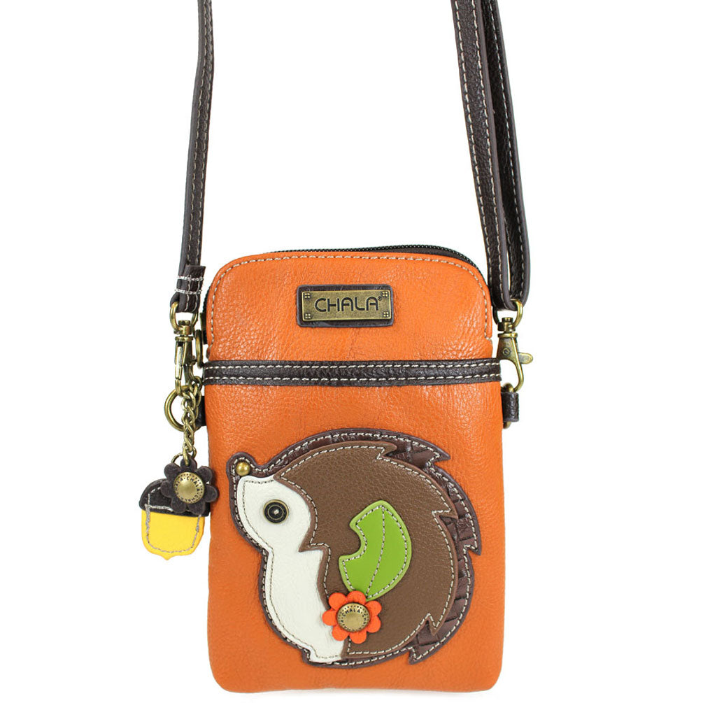 Convenient, Compact, FunSmall front pocket adorned with Hedgehog Chala PalAdjustable strap - turn bag into a purse, a crossbody bag, or even a pouch!Top zipper closureDecorative zipper pullExtra padding throughout bag to protect your cell phone3 credit card slots inside2 Adjustable straps that are detachableMaterials: Faux LeatherColor: OrangeApprox. Measurements: 5"W x 7"H x 1"DStrap adjustable: 7.5"-32"