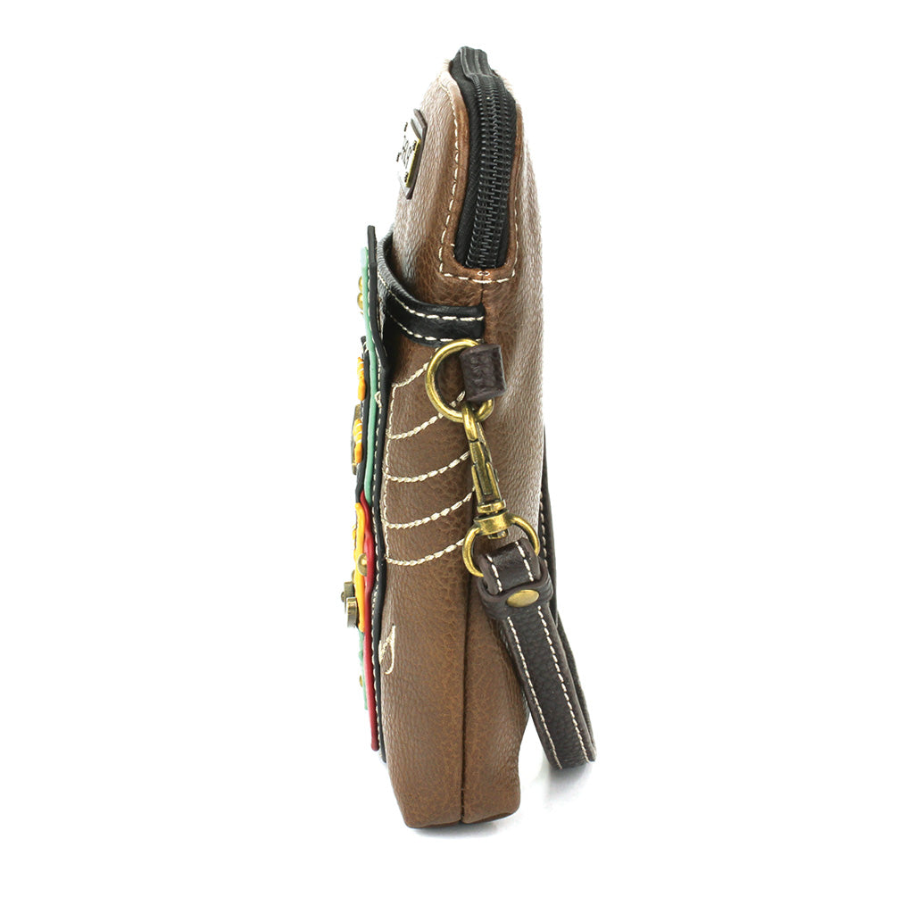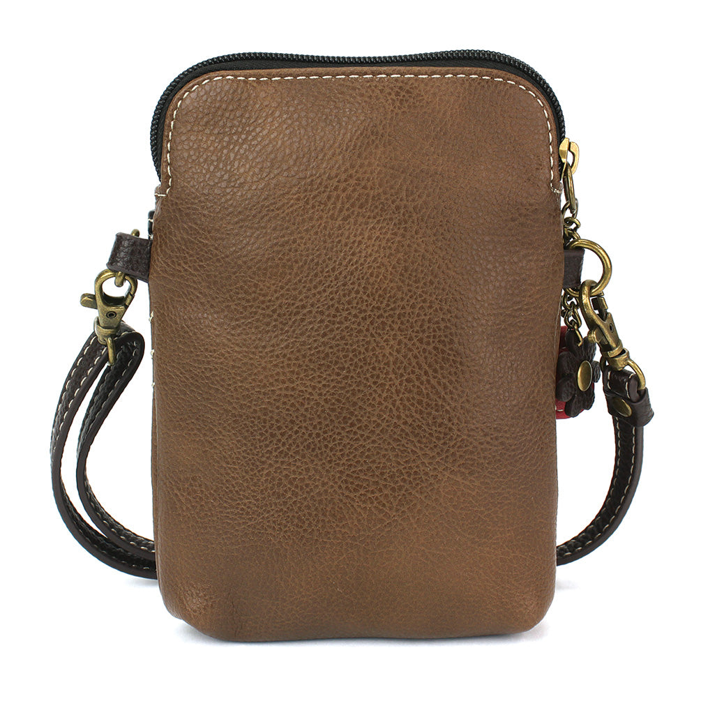 Convenient, Compact, FunSmall front pocket adorned with Guitar Chala PalAdjustable strap - turn bag into a purse, a crossbody bag, or even a pouch!Top zipper closureDecorative zipper pullExtra padding throughout bag to protect your cell phone3 credit card slots inside2 Adjustable straps that are detachableMaterials: Faux LeatherColor: BrownApprox. Measurements: 5"W x 7"H x 1"DStrap adjustable: 7.5"-32"