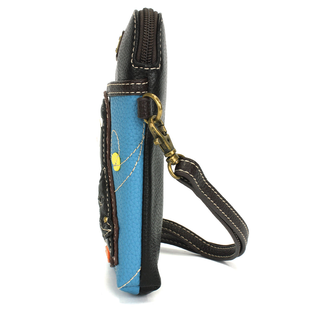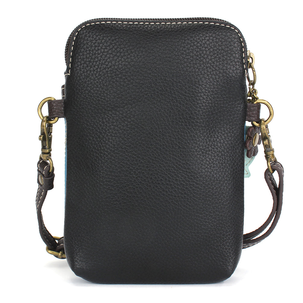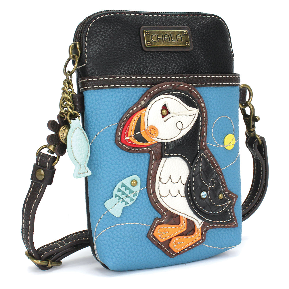 Convenient, Compact, FunSmall front pocket adorned with Puffin Chala PalAdjustable strap - turn bag into a purse, a crossbody bag, or even a pouch!Top zipper closureDecorative zipper pullExtra padding throughout bag to protect your cell phone3 credit card slots inside2 Adjustable straps that are detachableMaterials: Faux LeatherColor: BlueApprox. Measurements: 5"W x 7"H x 1"DStrap adjustable: 7.5"-32"