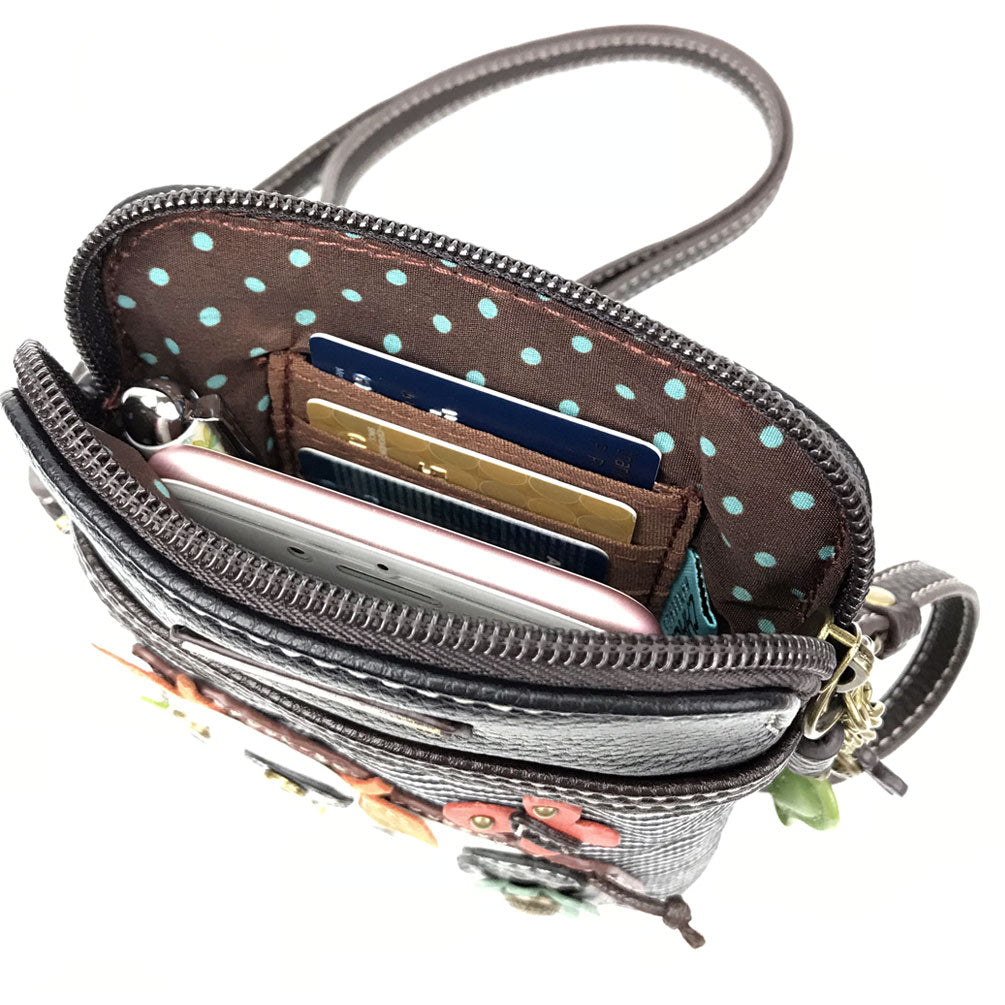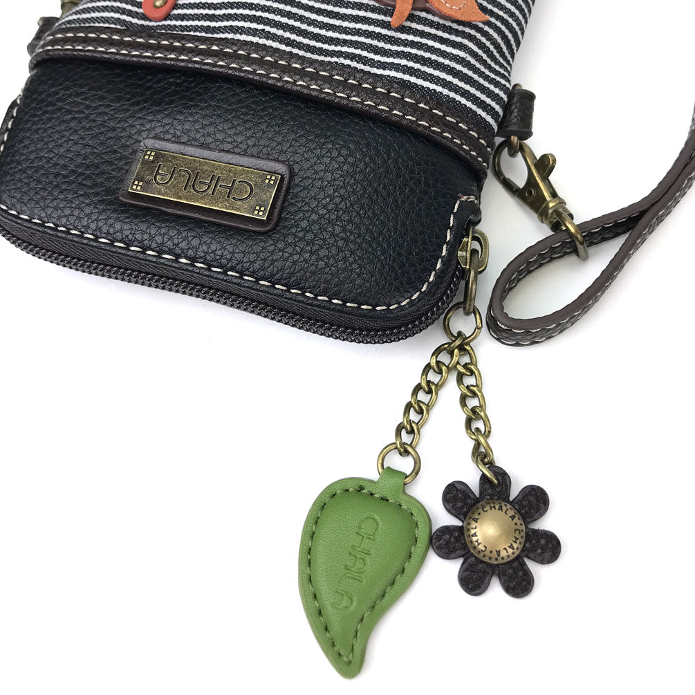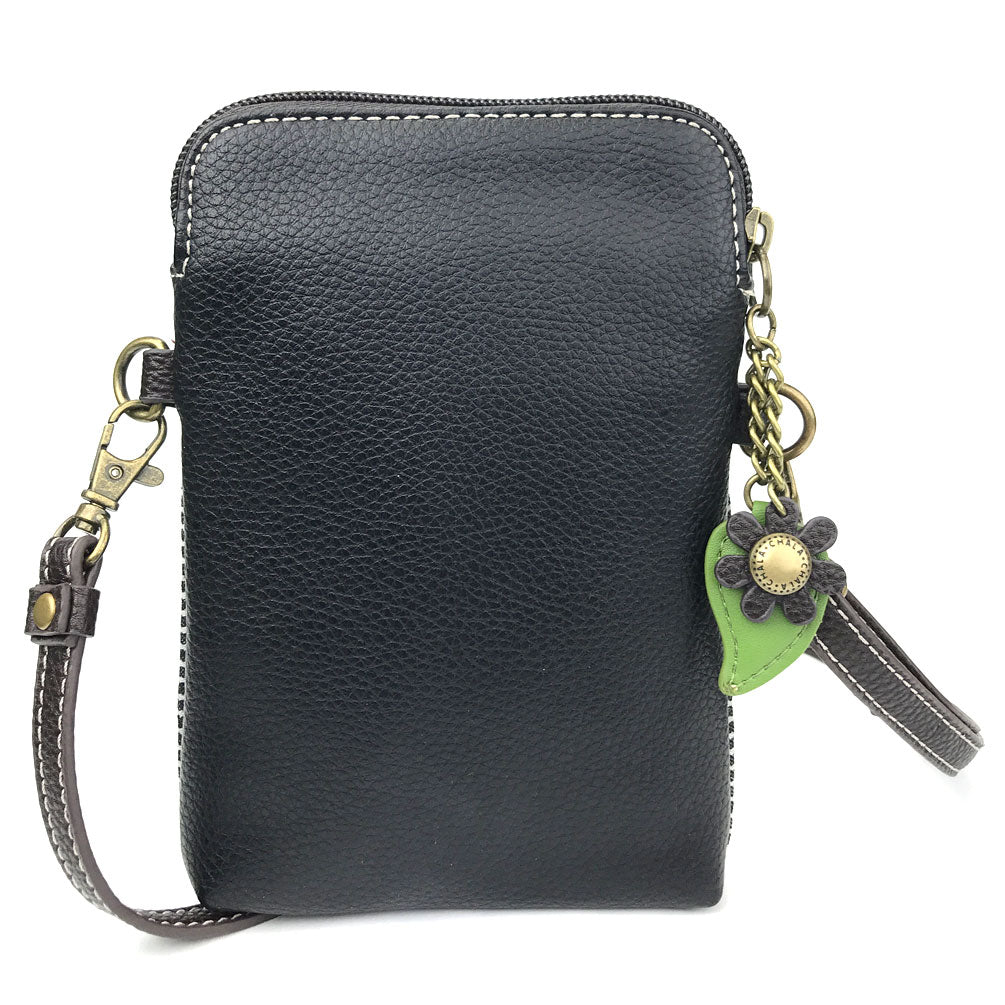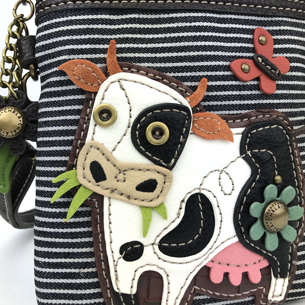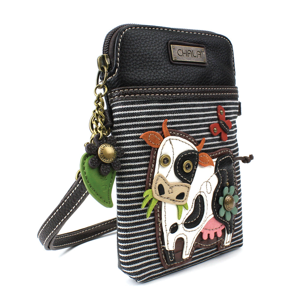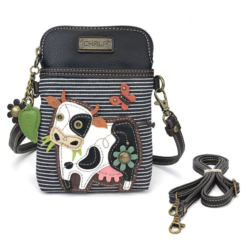 Convenient, Compact, FunSmall front pocket adorned with Cow Chala PalAdjustable strap - turn bag into a purse, a crossbody bag, or even a pouch!Top zipper closureDecorative zipper pullExtra padding throughout bag to protect your cell phone3 credit card slots inside2 Adjustable straps that are detachableMaterials: Faux LeatherColor: Black StripeApprox. Measurements: 5"W x 7"H x 1"DStrap adjustable: 7.5"-32"