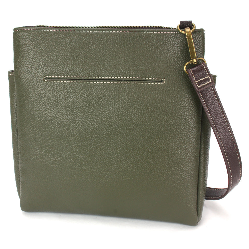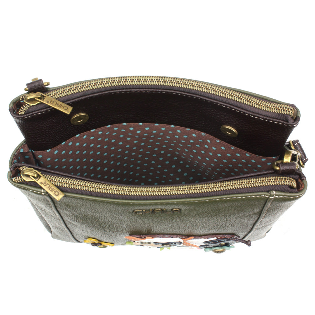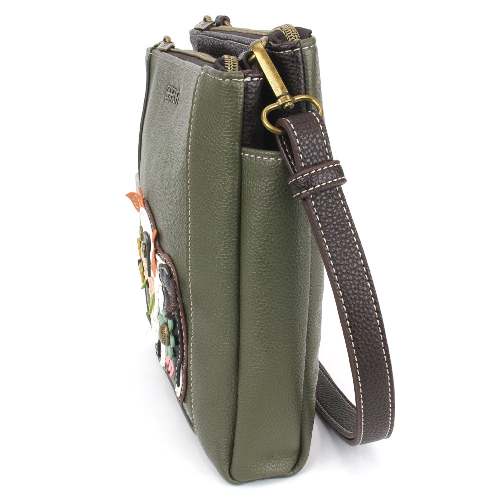 Fun, Practical, RFID ProtectedAdorned with Cow Chala Pal designStunning embellishments and embroidery patternsFront zipper pocket with (4) RFID Credit Card SlotsMiddle magnetic closure pocketZipper pocket with additional storage compartmentsRear slide pocket for small itemsCrossbody strap is detachable - can be adjusted and worn as a purse or crossbody! Materials: Faux LeatherColor: Olive Approx. Measurements: 8.5"W x 8.5"H x 1.5"DStrap adjustable: 16.5"-31"Designed in California, USAMade in ChinaColors may not be exactly as shown.Lining patterns may vary.