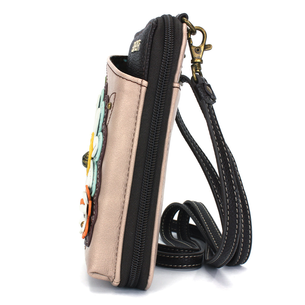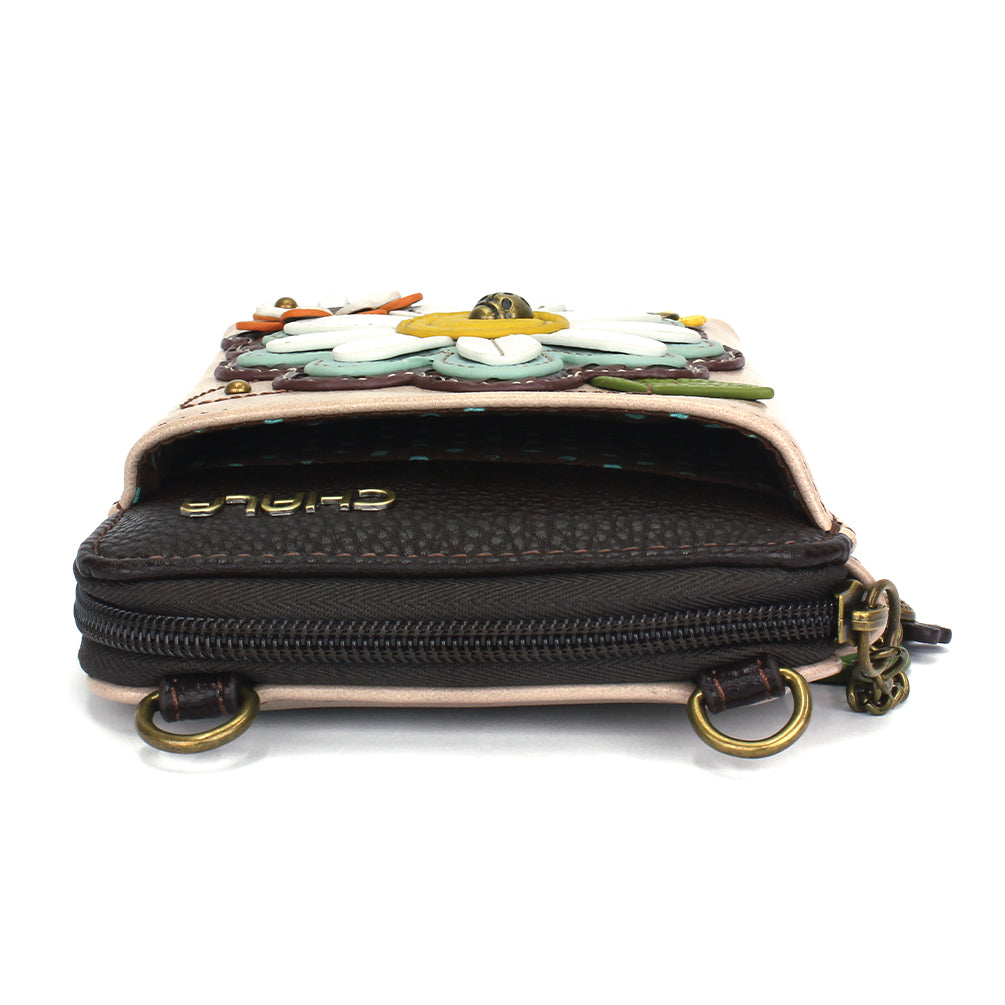 Efficient, Compact, Easy-To-CarryExquisite Daisy Chala Pal adorns the frontFront slide pocket fits smart phonesRear slide pocketZipper pull is a decorative charmZips open for large walletLots of slots, ID window, and zip pocket for coins2 straps includedConvertible straps make it a pouch, purse, or crossbodyMaterials: Faux LeatherColor: IvoryApprox. Measurements: 4.5"W x 7"H x 1.5"DStrap adjustable: 7.5"-32"Designed in California, USAMade in ChinaColors may not be exactly as shown.Lining patterns may vary.
