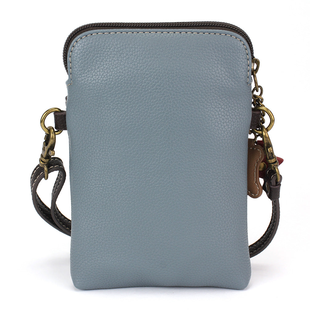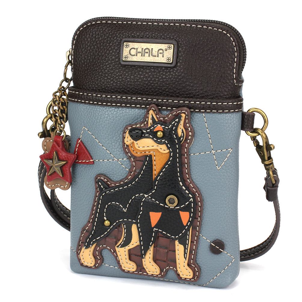 Convenient, Compact, FunSmall front pocket adorned with Doberman Chala PalAdjustable strap - turn bag into a purse, a crossbody bag, or even a pouch!Top zipper closureDecorative zipper pullExtra padding throughout bag to protect your cell phone3 credit card slots inside2 Adjustable straps that are detachableMaterials: Faux LeatherColor: Blue GrayApprox. Measurements: 5"W x 7"H x 1"DStrap adjustable: 7.5"-32"