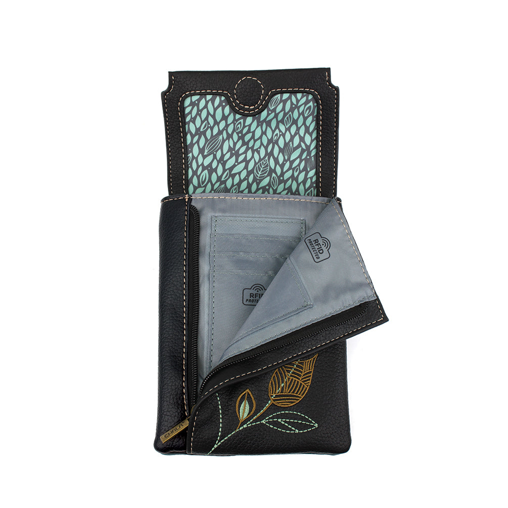 RFID Protected, Simple, and FashionableExquisitely detailed and embroidered Dragonfly designDual sided design to match any outfit or moodMain pocket features a flap top with magnetic button closureFront zip-down pocket for easy access to RFID protected Credit Card slots Rear slide pocket (1) Adjustable strap with dual colorsMaterials: Nylon / Faux LeatherColor: BlackApprox. Measurements: 5.5"W x 7.5"H x 1"DStrap adjustable: 16.5"-31.5"Designed in California, USAMade in ChinaColors may not be exactly as shown.Lining patterns may vary.