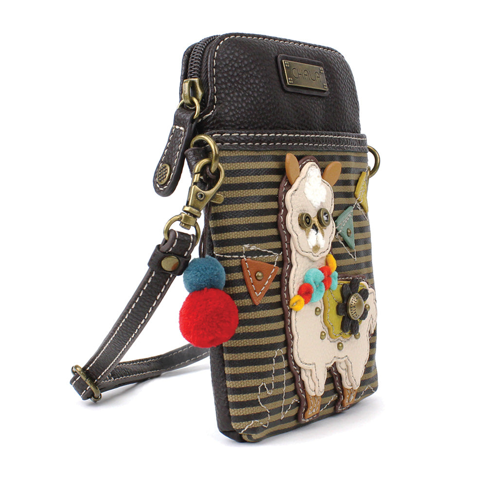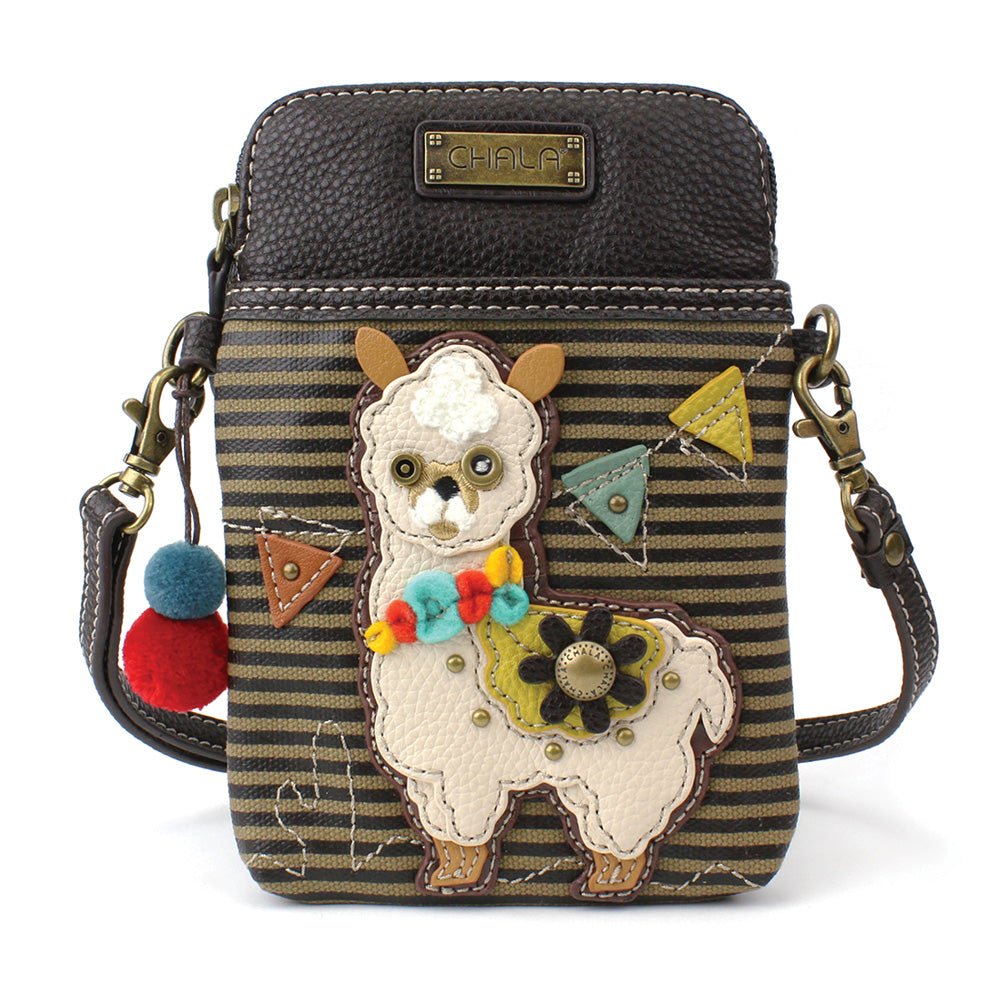 Convenient, Compact, FunSmall front pocket adorned with Llama Chala PalAdjustable strap - turn bag into a purse, a crossbody bag, or even a pouch!Top zipper closureDecorative zipper pullExtra padding throughout bag to protect your cell phone3 credit card slots inside2 Adjustable straps that are detachableMaterials: Faux LeatherColor: Olive StripeApprox. Measurements: 5"W x 7"H x 1"DStrap adjustable: 7.5"-32"