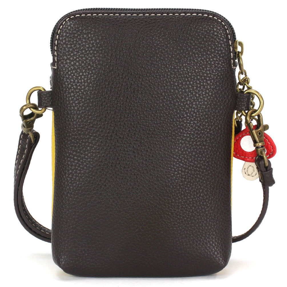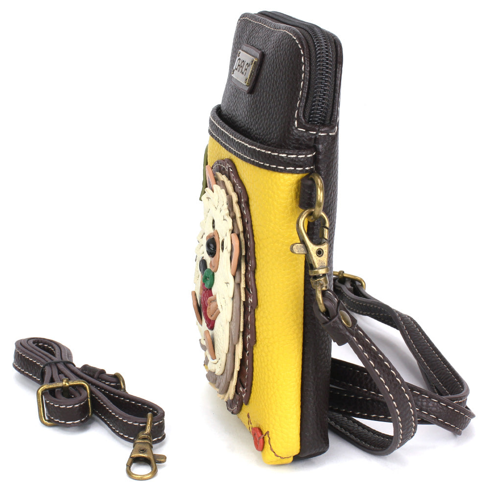 Convenient, Compact, FunSmall front pocket adorned with Hedgehog A Chala PalAdjustable strap - turn bag into a purse, a crossbody bag, or even a pouch!Top zipper closureDecorative zipper pullExtra padding throughout bag to protect your cell phone3 credit card slots inside2 Adjustable straps that are detachableMaterials: Faux LeatherColor: Mustard Approx. Measurements: 5"W x 7"H x 1"DStrap adjustable: 7.5"-32"