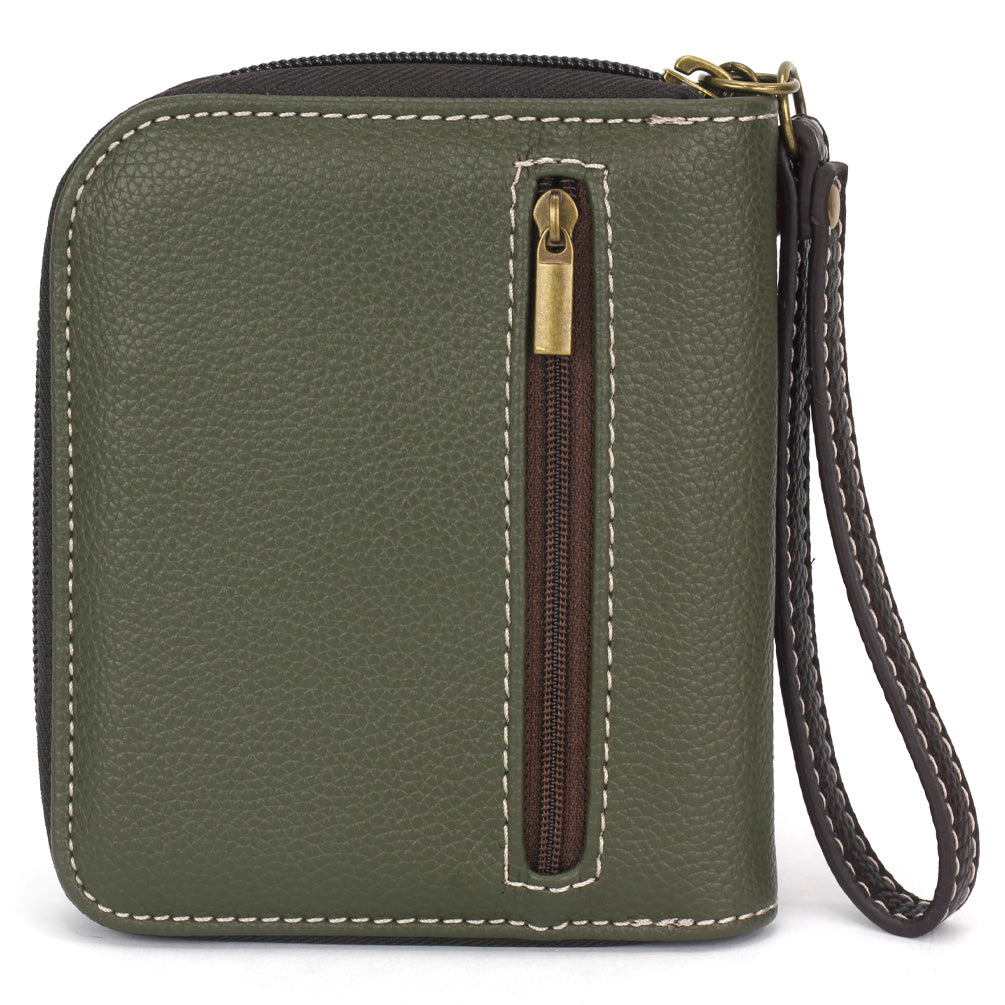 Stylish, Fun, FunctionalThe front is adorned with our Hedgehog A Chala Pal design!Comes with a decorative zipper pull charmLots of slots for your cards and cashOne clear slot for photo IDBack zipper pocket for coins and other small itemsMaterials: Faux LeatherColor: Olive Approx. Measurements: 4.5"W x 5.5"H x 1"DDesigned in California, USAMade in ChinaColors may not be exactly as shown.Lining patterns may vary.
