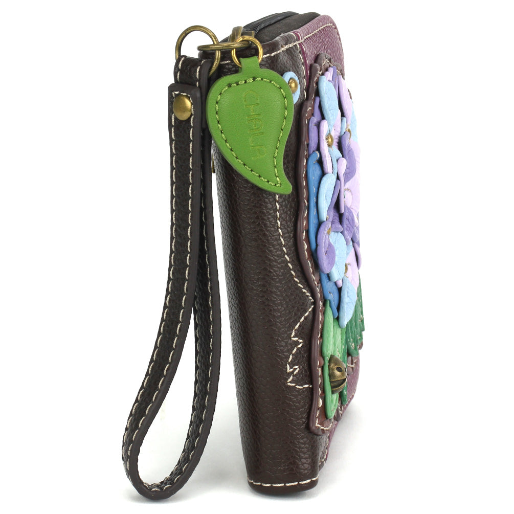 Stylish, Fun, FunctionalThe front is adorned with our Hydrangea Chala Pal design!Comes with a decorative zipper pull charmLots of slots for your cards and cashOne clear slot for photo IDBack zipper pocket for coins and other small itemsMaterials: Faux LeatherColor: Purple Approx. Measurements: 4.5"W x 5.5"H x 1"DDesigned in California, USAMade in ChinaColors may not be exactly as shown.Lining patterns may vary.