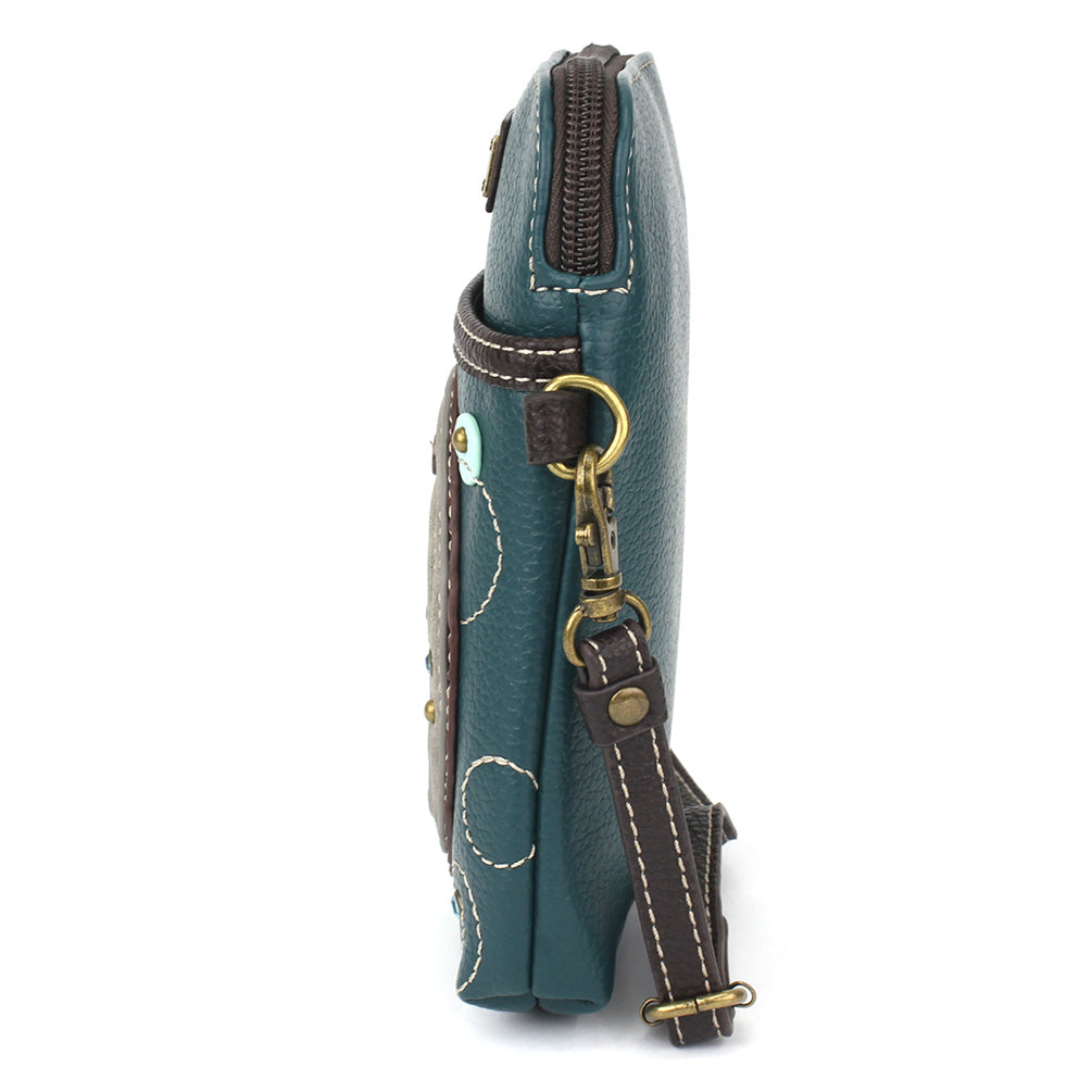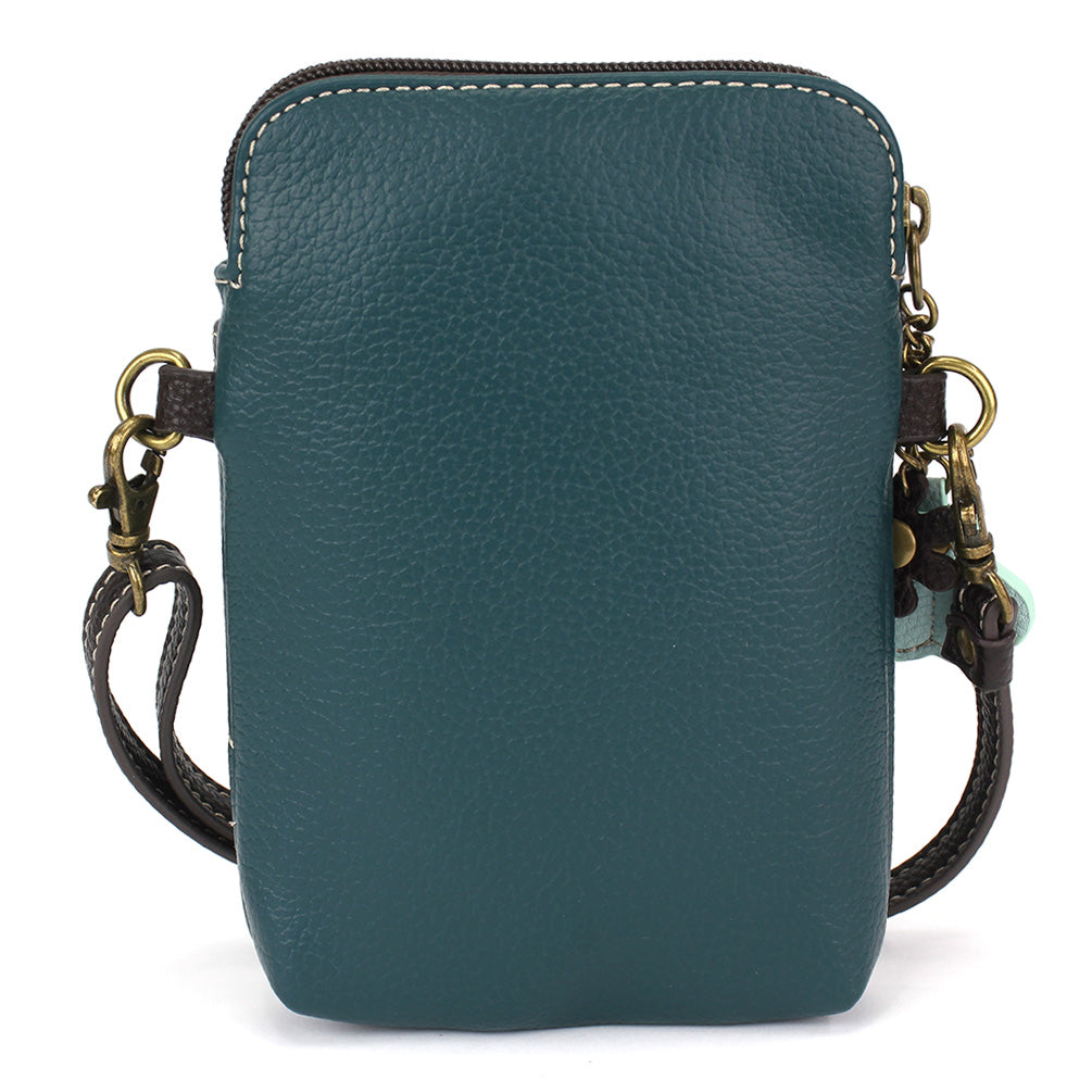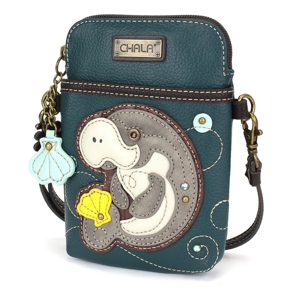 Convenient, Compact, FunSmall front pocket adorned with Manatee Chala PalAdjustable strap - turn bag into a purse, a crossbody bag, or even a pouch!Top zipper closureDecorative zipper pullExtra padding throughout bag to protect your cell phone3 credit card slots inside2 Adjustable straps that are detachableMaterials: Faux LeatherColor: TurquoiseApprox. Measurements: 5"W x 7"H x 1"DStrap adjustable: 7.5"-32"