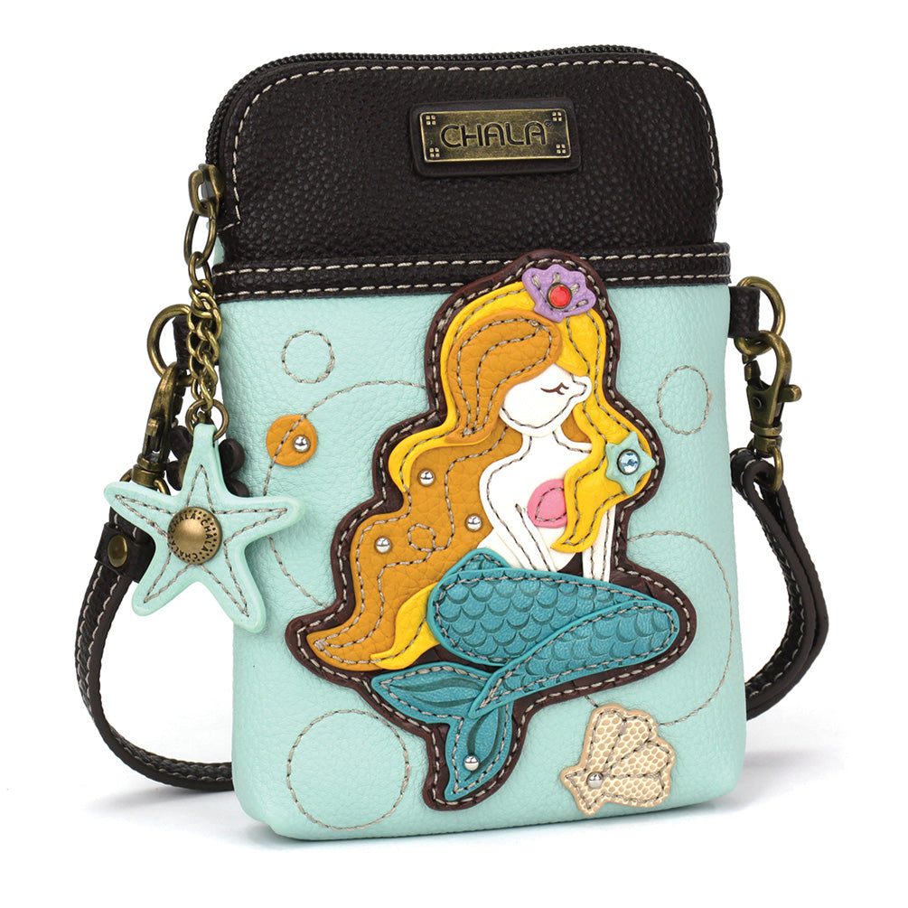 Convenient, Compact, FunSmall front pocket adorned with Mermaid A Chala PalAdjustable strap - turn bag into a purse, a crossbody bag, or even a pouch!Top zipper closureDecorative zipper pullExtra padding throughout bag to protect your cell phone3 credit card slots inside2 Adjustable straps that are detachableMaterials: Faux LeatherColor: BlueApprox. Measurements: 5"W x 7"H x 1"DStrap adjustable: 7.5"-32"