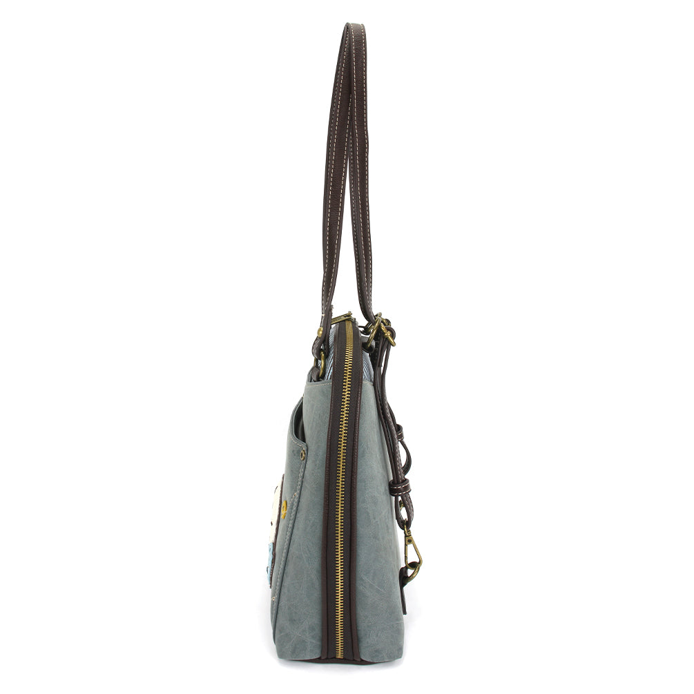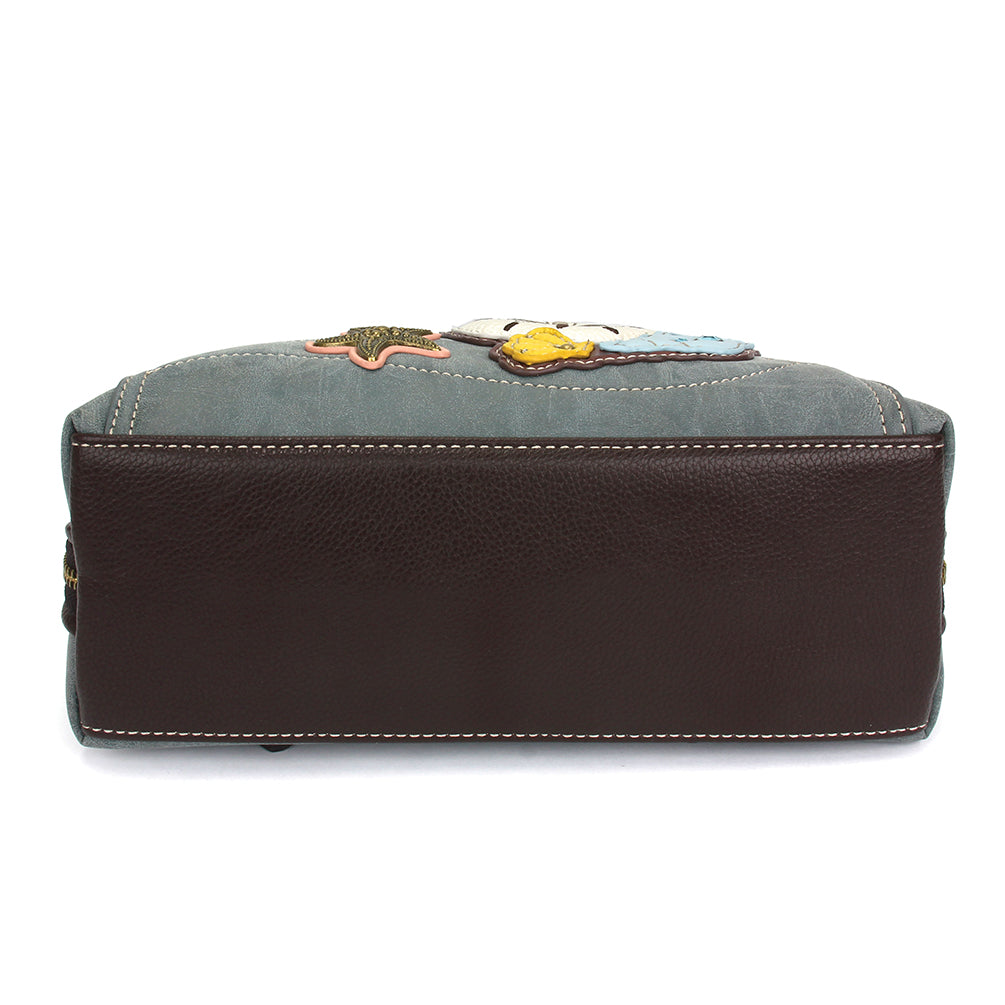 Roomy, Versatile, and FunAdorned with Sand Dollar Chala Pal designDual strap configurations - can be worn as a Backpack or Shoulder Bag by converting strapsMain compartment features multiple pockets for storage Wide mouth zipper opening for easy access to belongingsFront zipper pocketFront slide pocketAdjustable strapsMaterials: Faux Leather / Cotton CanvasColor: IndigoApprox. Measurements: 9.5"W x 10"H x 3.5"DStrap adjustable: 6"-15"Designed in California, USAMade in ChinaColors may not be exactly as shown.Lining patterns may vary.