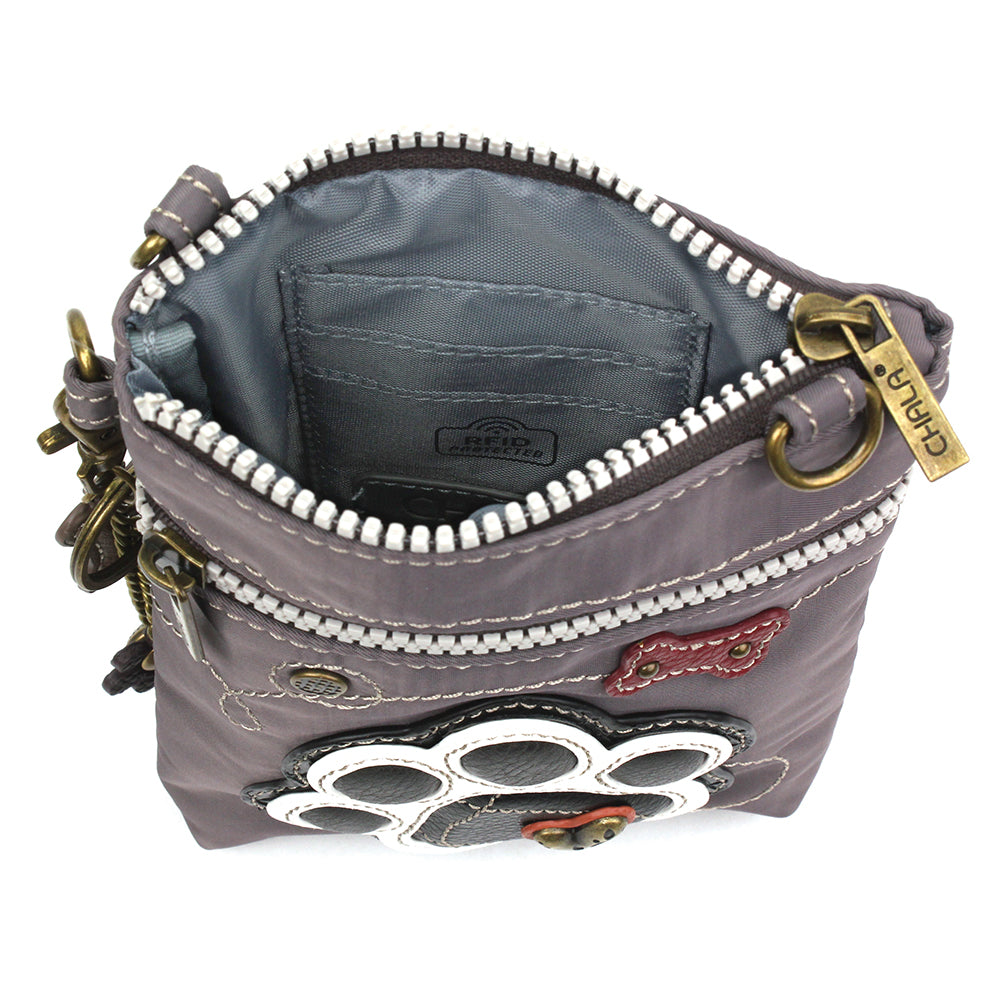 RFID Protected, Simplistic, and LightweightEmbellished with Pawprint Chala Pal designExquisitely detailed embroidery patternsEntire bag is RFID Protected3 interior credit card slotsTop zipper closure and front zipper pocketLarge front pocket to fit your smart phoneAdjustable strap - turn bag into a purse, a crossbody bag, or even a pouch!Detachable key-strap includedAntique brass hardware and CHALA emblemMaterials: Nylon / Faux LeatherColor: GrayApprox. Measurements: 5"W x 7"H x 1"DStrap adjustable: 16.5"-31"Designed in California, USAMade in ChinaColors may not be exactly as shown.