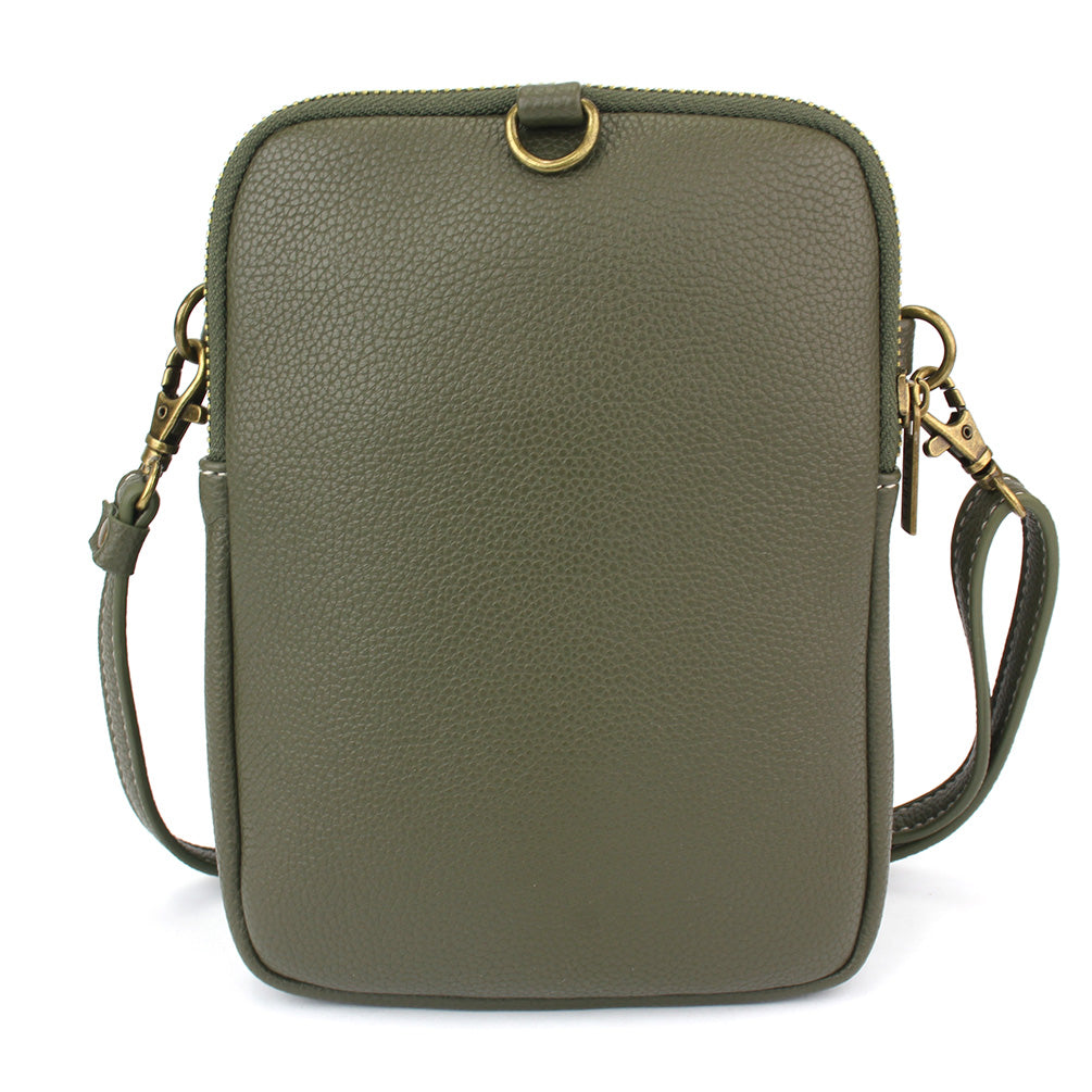 Unique, Sophisticated, FunSmall front pocket adorned with Cactus Chala designVersatile straps - wearable many ways!Two zipper pocketsRFID Protected lining in front pocket3 interior credit card slotsAntique brass toned hardwareNew and improved size with sophisticated design patternsMaterials: Faux LeatherColor: OliveApprox. Measurements: 5.5"W x 7.5"H x 2"DStrap adjustable: 14"-30"Designed in California, USA Made in ChinaColors may not be exactly as shown.