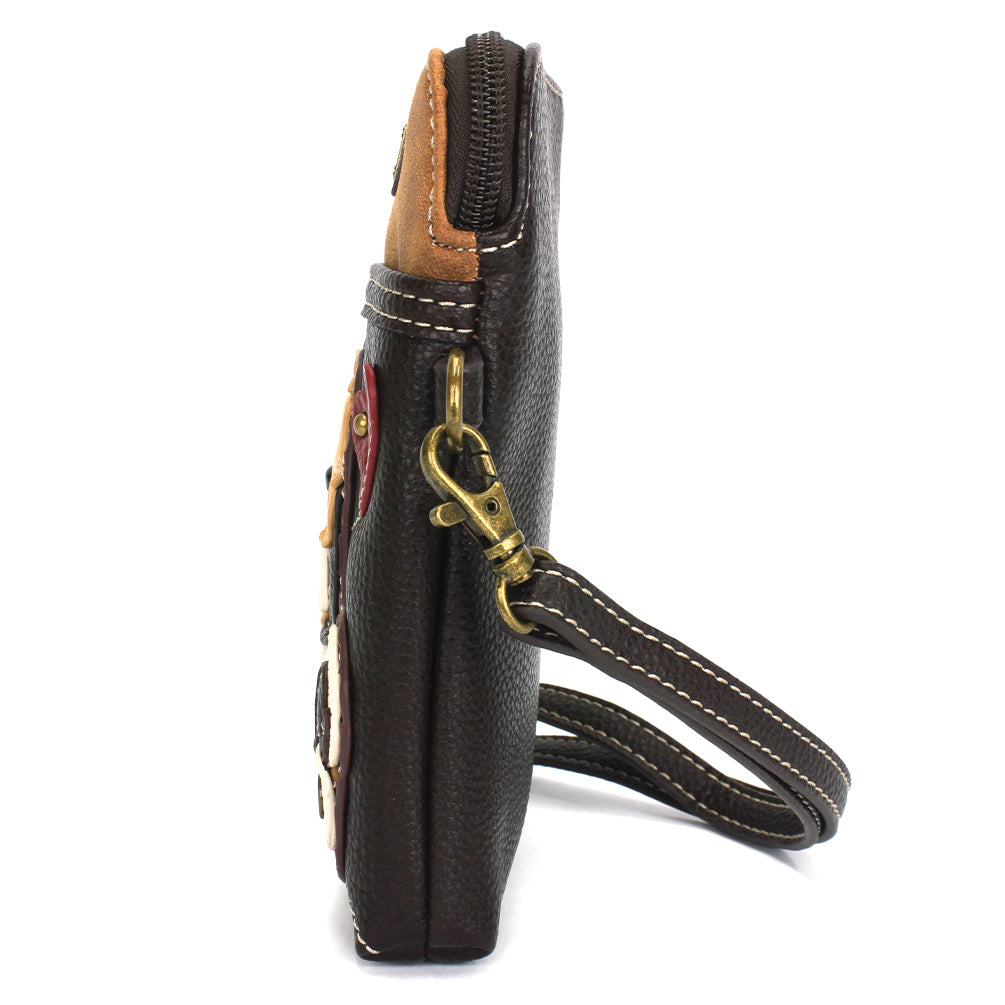 Convenient, Compact, FunSmall front pocket adorned with Brown Shih Tzu Chala PalAdjustable strap - turn bag into a purse, a crossbody bag, or even a pouch!Top zipper closureDecorative zipper pullExtra padding throughout bag to protect your cell phone3 credit card slots inside2 Adjustable straps that are detachableMaterials: Faux LeatherColor: Dark BrownApprox. Measurements: 5"W x 7"H x 1"DStrap adjustable: 7.5"-32"