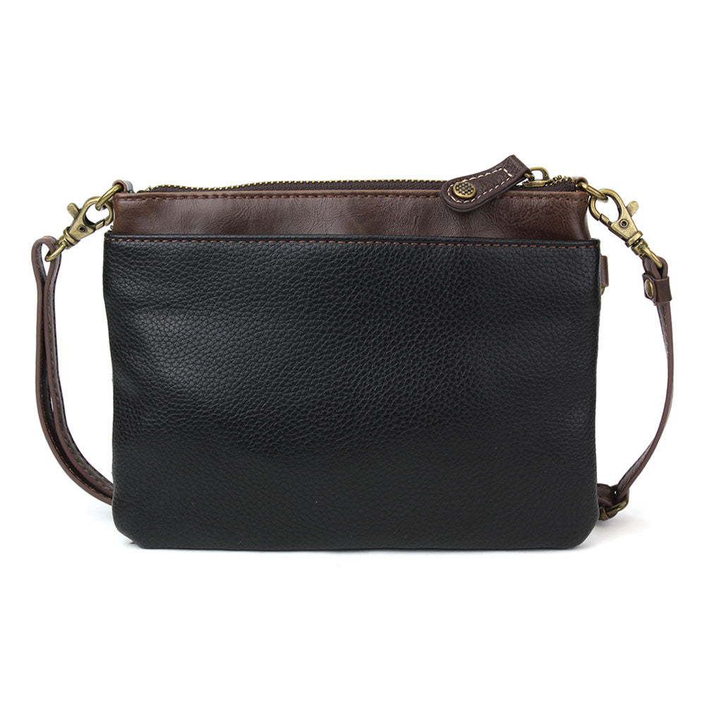 Stylish, Compact, VersatileAdorned with dazzling Starburst design2 Adjustable straps that are detachable1 Internal Zippered Compartment1 External Zippered Compartment Multiple Credit Card PocketsPatterned fabric liningFeatures antique, brass toned hardwareMaterials: Faux LeatherColor: BlackApprox. Measurements: 8"W x 6"H x 0.5"DStrap adjustable: 7.5"-32"Designed in California, USAMade in ChinaColors may not be exactly as shownLining patterns may vary