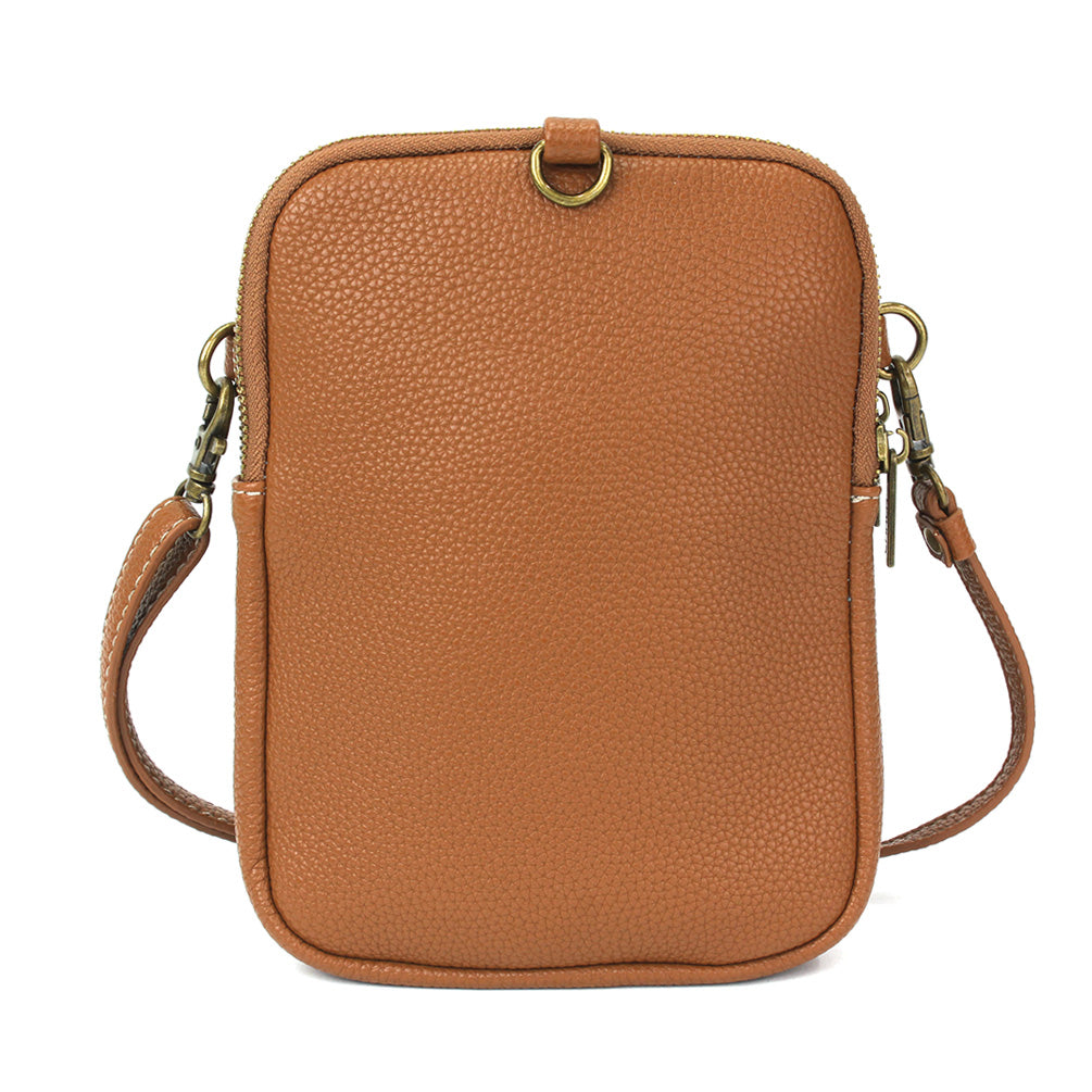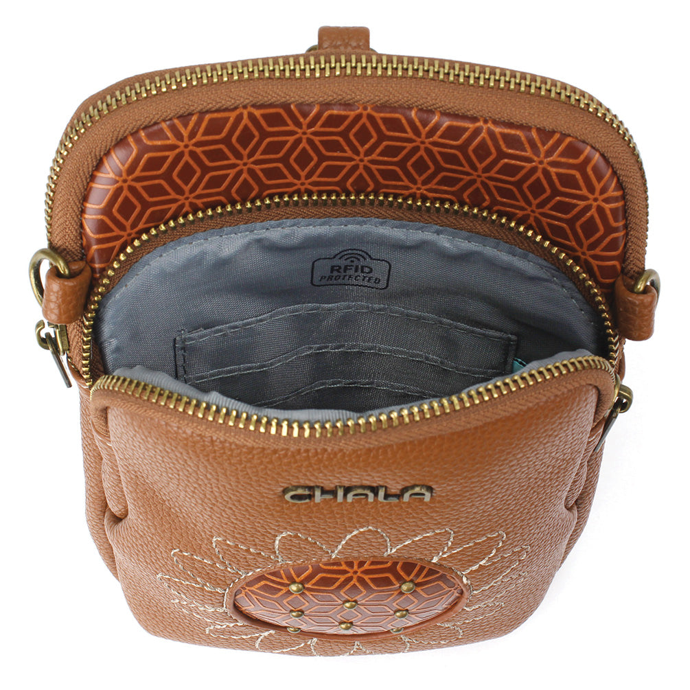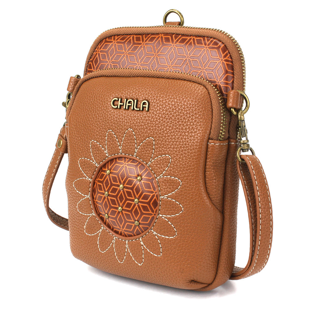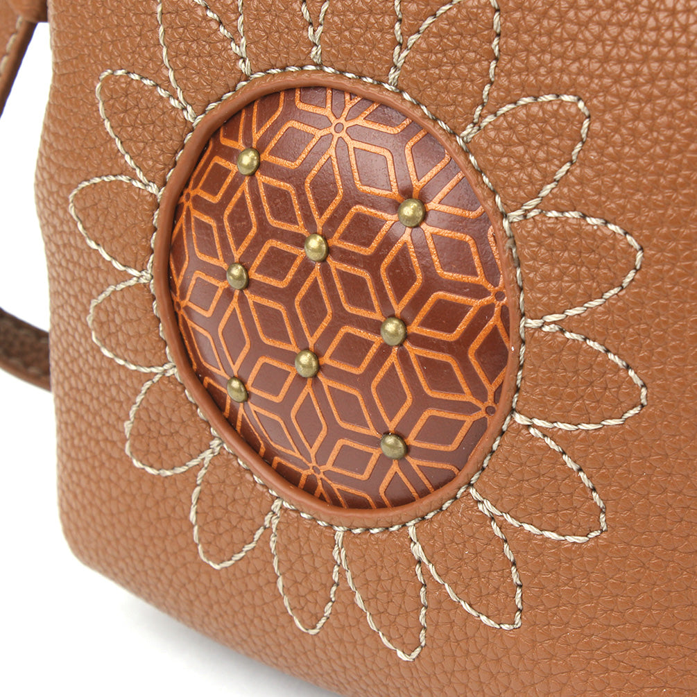 Unique, Sophisticated, FunSmall front pocket adorned with Sunflower Chala designVersatile straps - wearable many ways!Two zipper pocketsRFID Protected lining in front pocket3 interior credit card slotsAntique brass toned hardwareNew and improved size with sophisticated design patternsMaterials: Faux LeatherColor: BrownApprox. Measurements: 5.5"W x 7.5"H x 2"DStrap adjustable: 14"-30"Designed in California, USA Made in ChinaColors may not be exactly as shown.