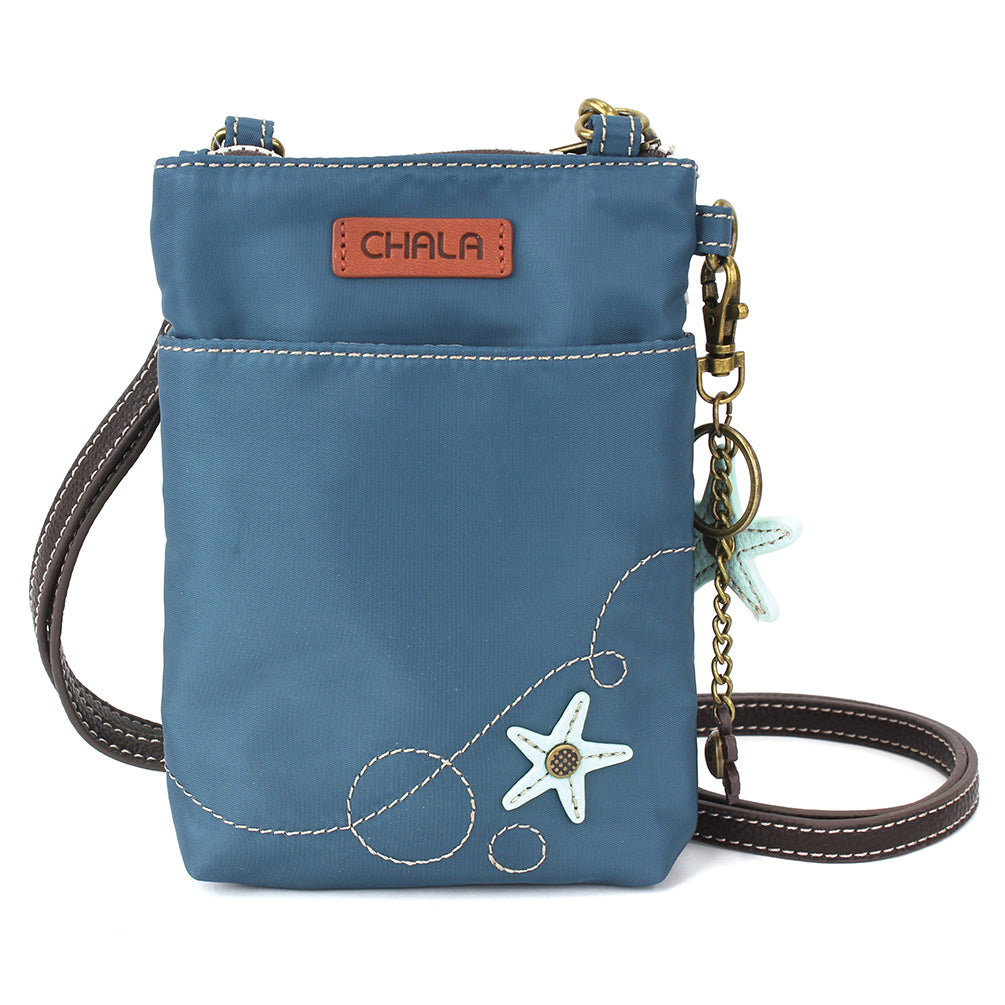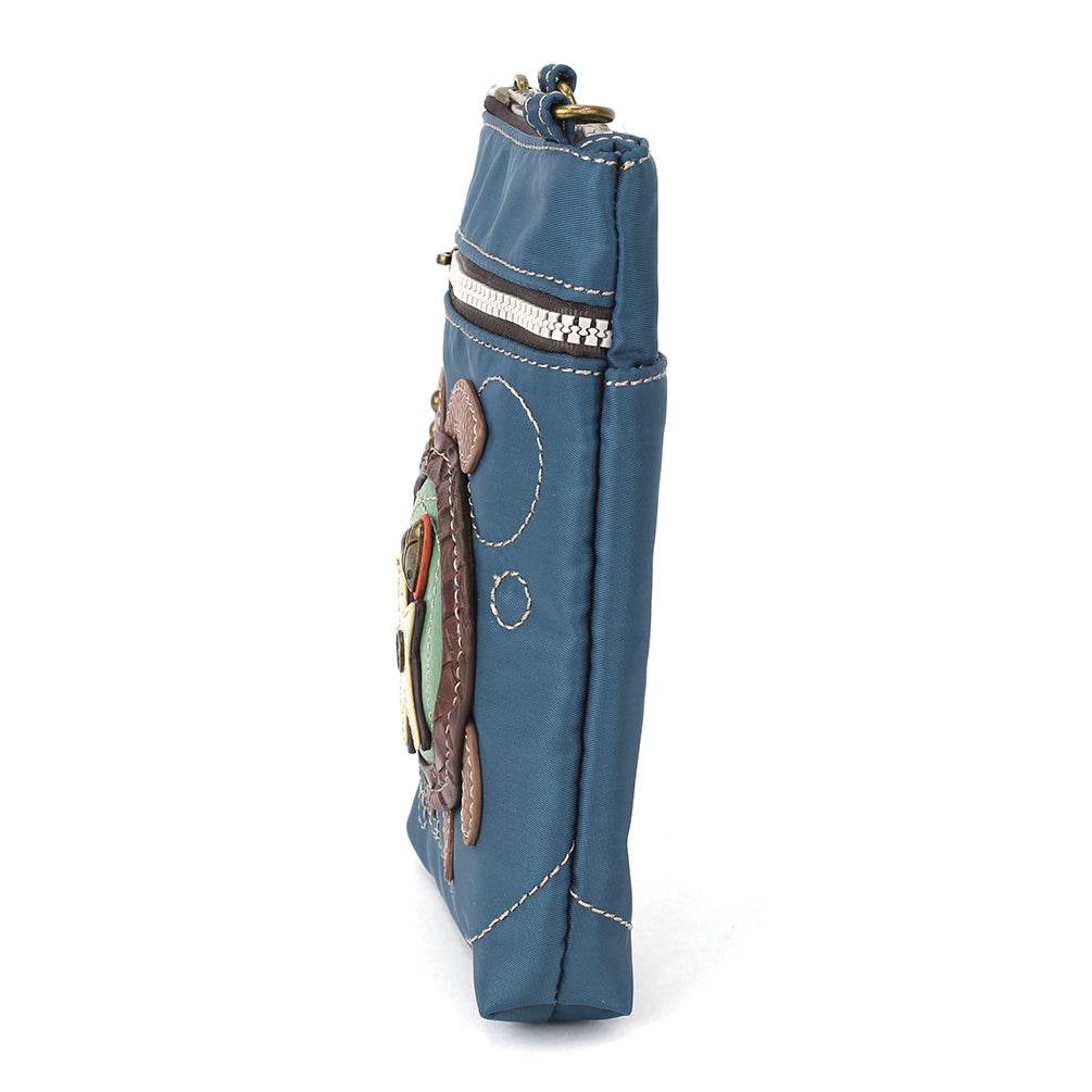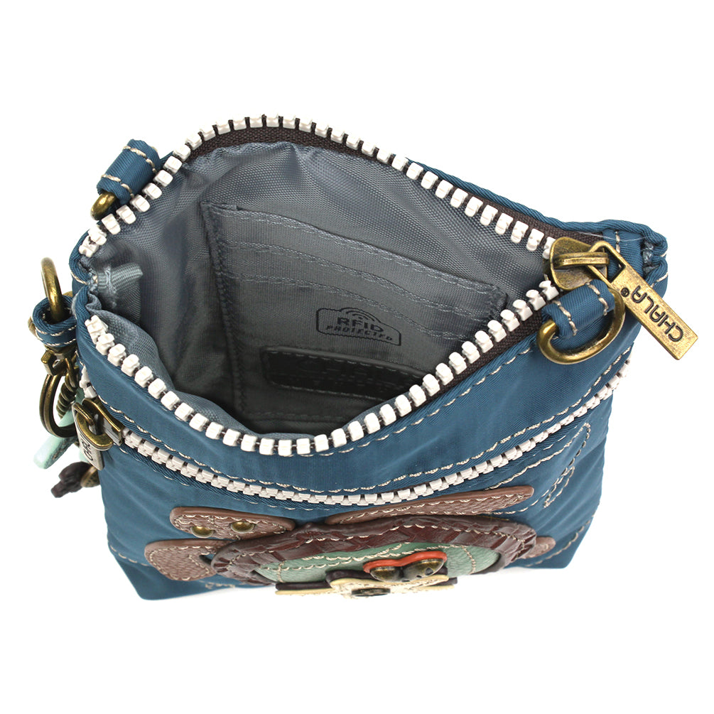 RFID Protected, Simplistic, and LightweightEmbellished with Turtle Chala Pal designExquisitely detailed embroidery patternsEntire bag is RFID Protected3 interior credit card slotsTop zipper closure and front zipper pocketLarge front pocket to fit your smart phoneAdjustable strap - turn bag into a purse, a crossbody bag, or even a pouch!Detachable key-strap includedAntique brass hardware and CHALA emblemMaterials: Nylon / Faux LeatherColor: TurquoiseApprox. Measurements: 5"W x 7"H x 1"DStrap adjustable: 16.5"-31"Designed in California, USAMade in ChinaColors may not be exactly as shown.