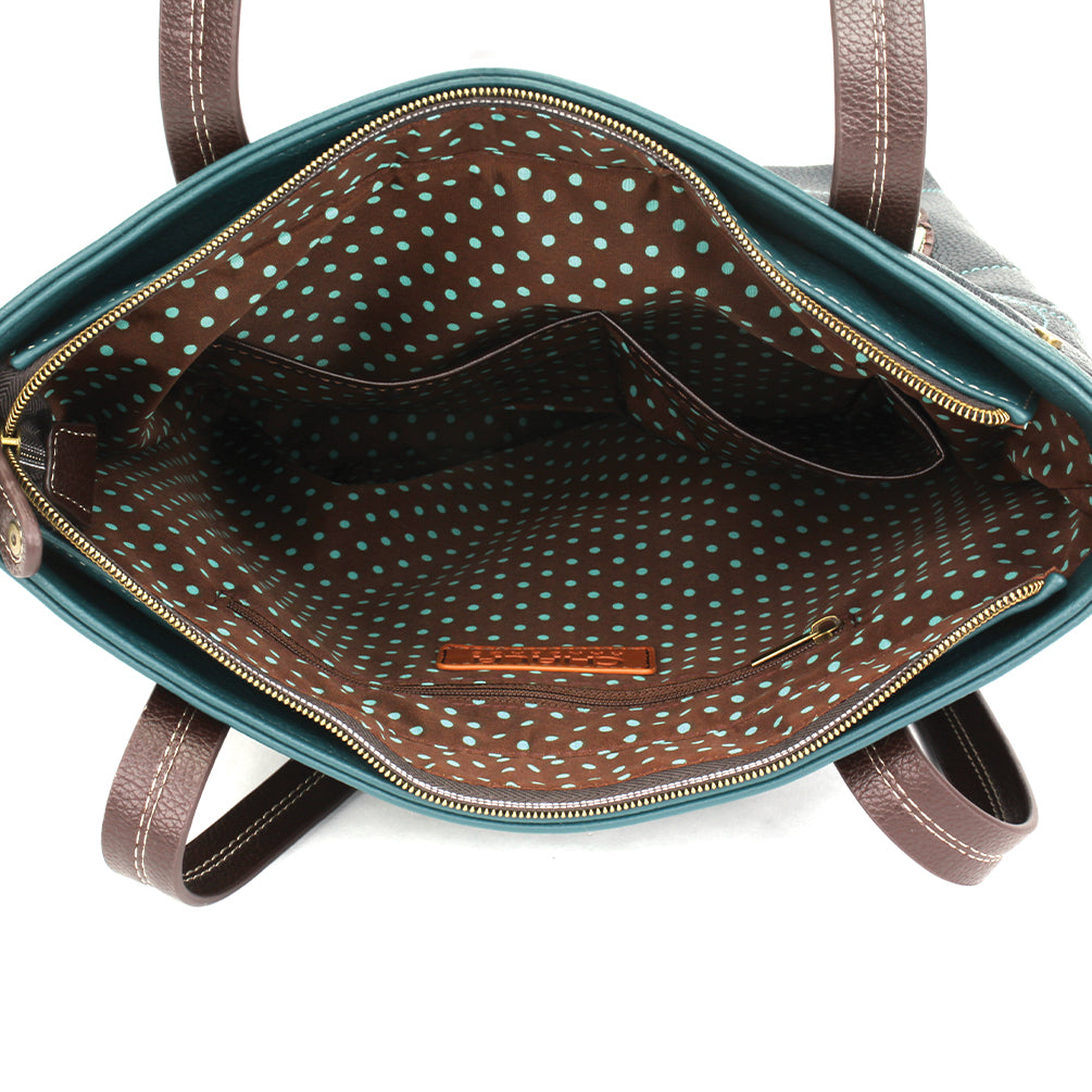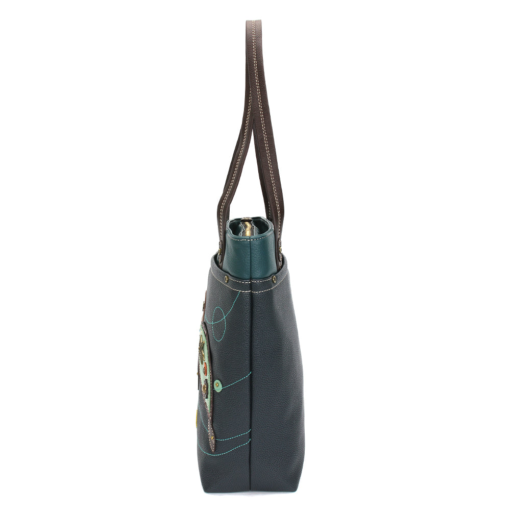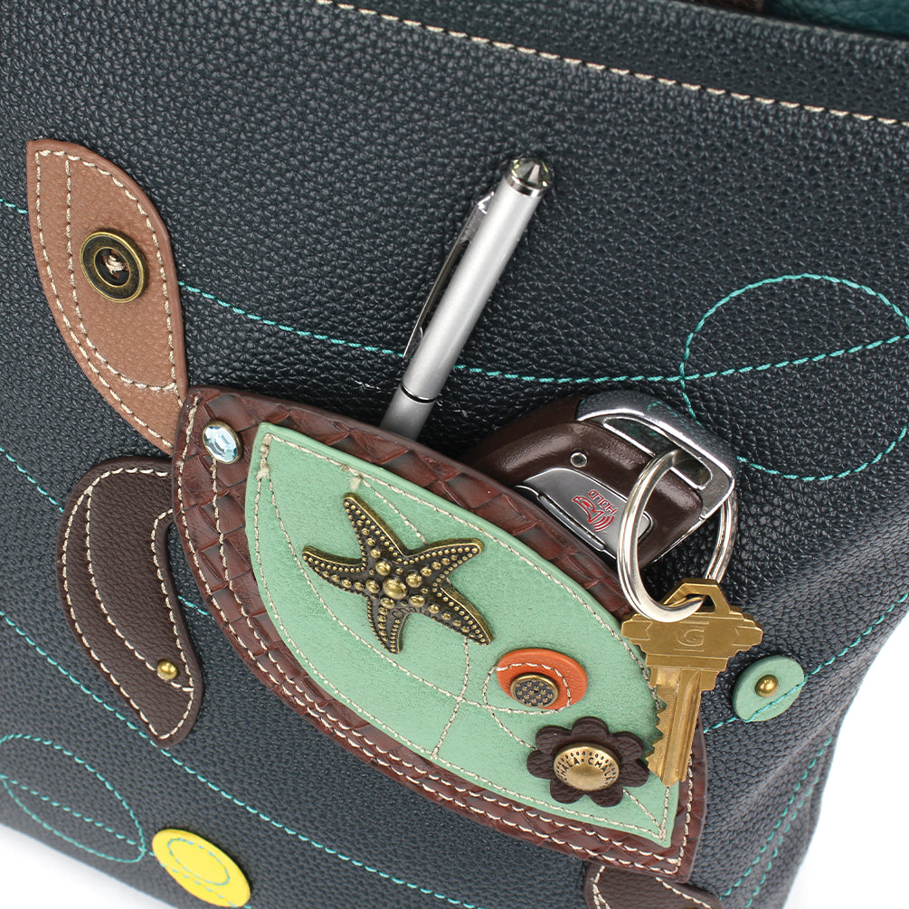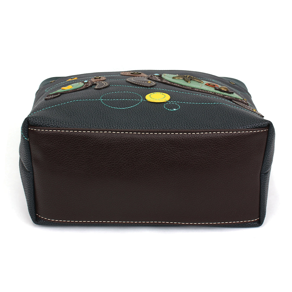 Bold, Functional, and FunExquisite Turtles Chala Pal design adorns the front!Character is a pocketDetailed stitching and embroidery patternsFront and rear snap closure pocketsMain compartment has patterned fabric lining with additional slide and zipper pocketsComfortable shoulder strapsMaterials: Faux LeatherColor: NavyApprox. Measurements: 9.5"W x 13"H x 4.5"DHandle Drops: 10"Designed in California, USAMade in ChinaColors may not be exactly as shownLining patterns may vary