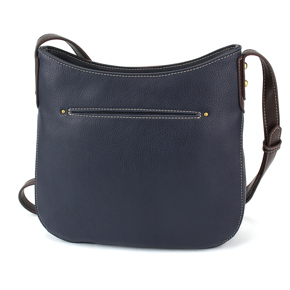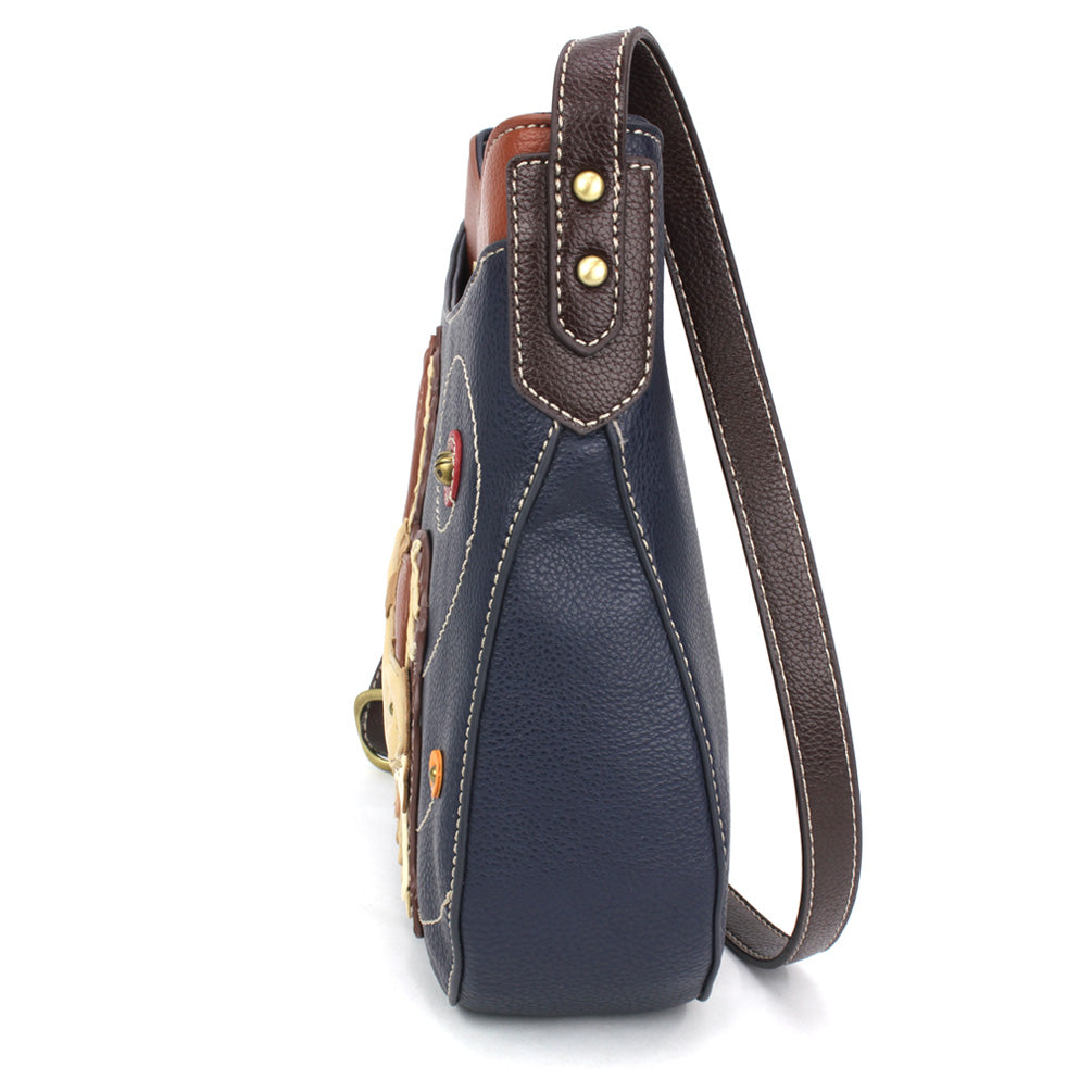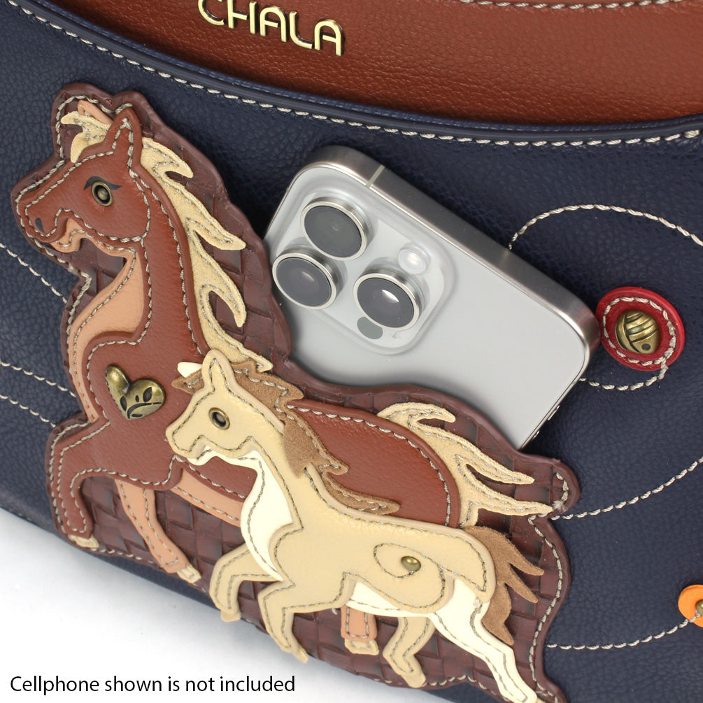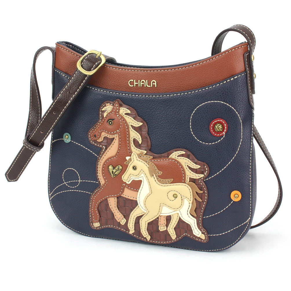 Compact, Light, ConvenientAdorned with faux leather Horse Family Chala Pal design!Adjustable shoulder strapTop zip closure Front zipper pocket Rear slide pocketPatterned inner fabric lining with slide and zipper pocketsFeatures antique, brass toned hardware Materials: Faux leatherColor: NavyApprox. Measurements: 10"W x 9"H x 3"DStrap adjustable: 24"-28"Designed in California, USAMade in ChinaColors may not be exactly as shown.Lining patterns may vary.