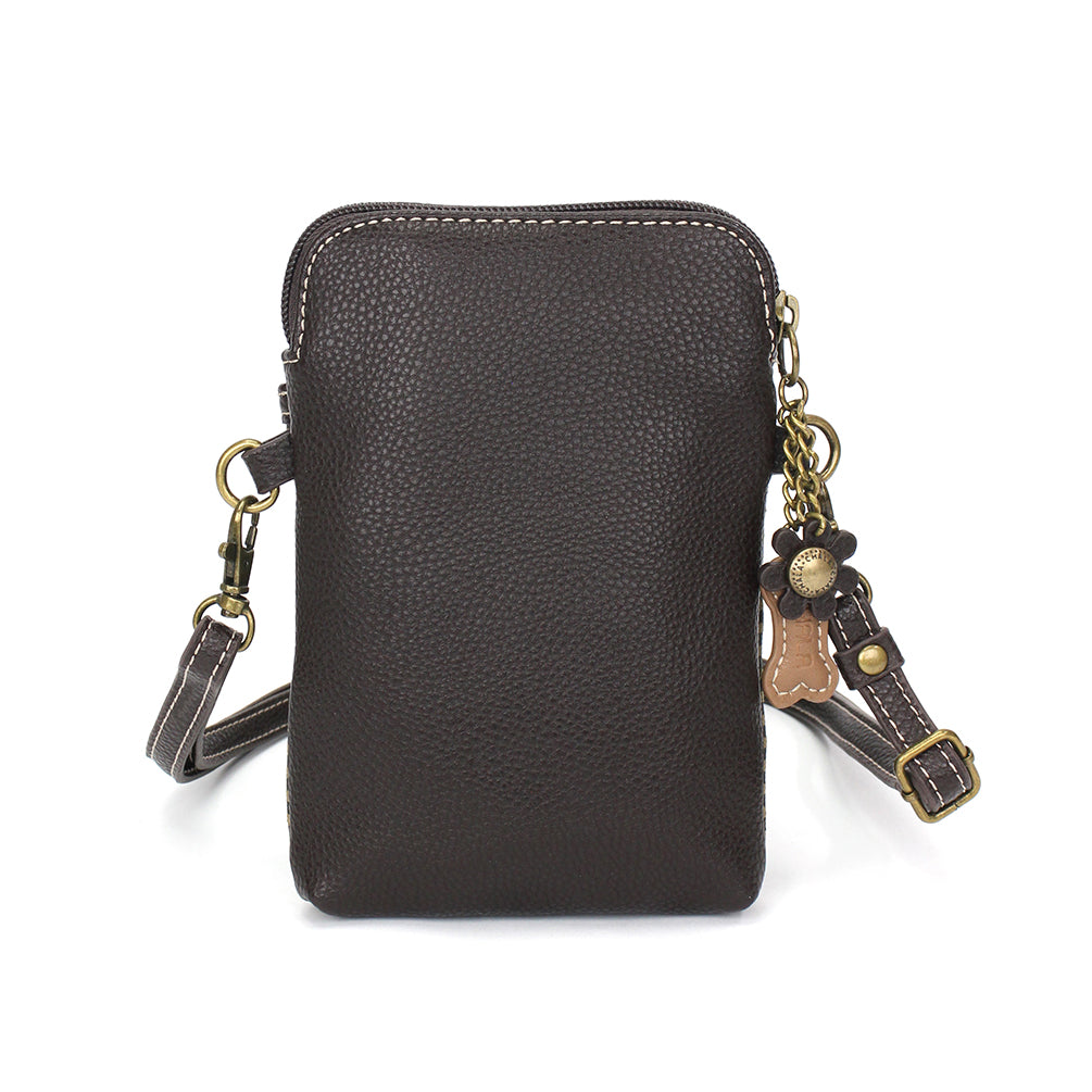Convenient, Compact, FunSmall front pocket adorned with Yorkshire Chala PalAdjustable strap - turn bag into a purse, a crossbody bag, or even a pouch!Top zipper closureDecorative zipper pullExtra padding throughout bag to protect your cell phone3 credit card slots inside2 Adjustable straps that are detachableMaterials: Faux LeatherColor: Brown StripeApprox. Measurements: 5"W x 7"H x 1"DStrap adjustable: 7.5"-32"