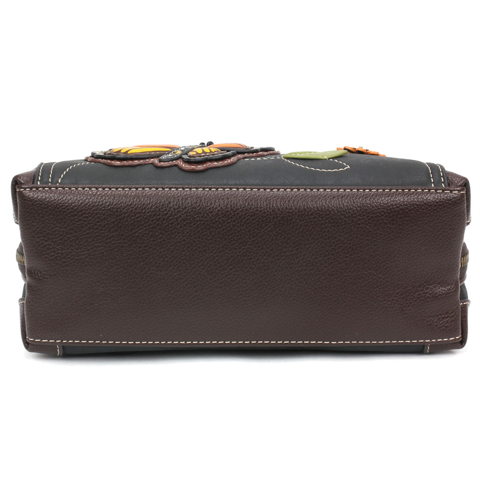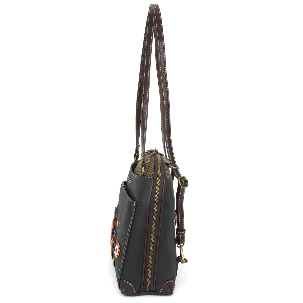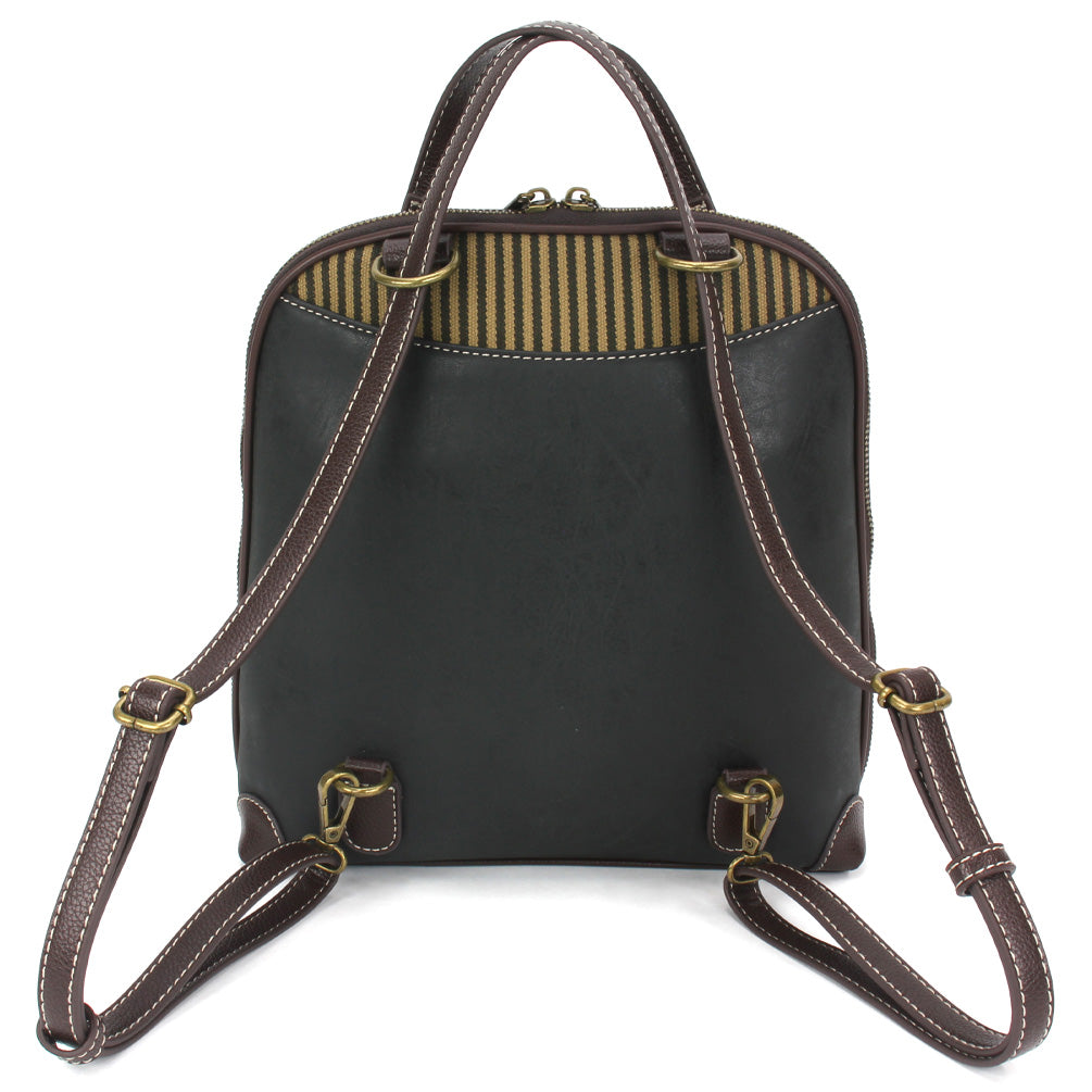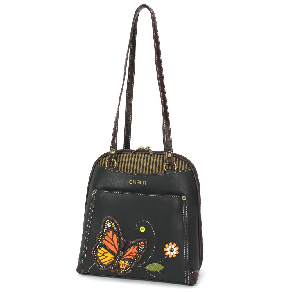 Roomy, Versatile, and FunAdorned with Monarch Butterfly Chala Pal designDual strap configurations - can be worn as a Backpack or Shoulder Bag by converting strapsMain compartment features multiple pockets for storage Wide mouth zipper opening for easy access to belongingsFront zipper pocketFront slide pocketAdjustable strapsMaterials: Faux Leather / Cotton CanvasColor: Black Approx. Measurements: 9.5"W x 10"H x 3.5"DStrap adjustable: 6"-15"Designed in California, USAMade in ChinaColors may not be exactly as shown.Lining patterns may vary.
