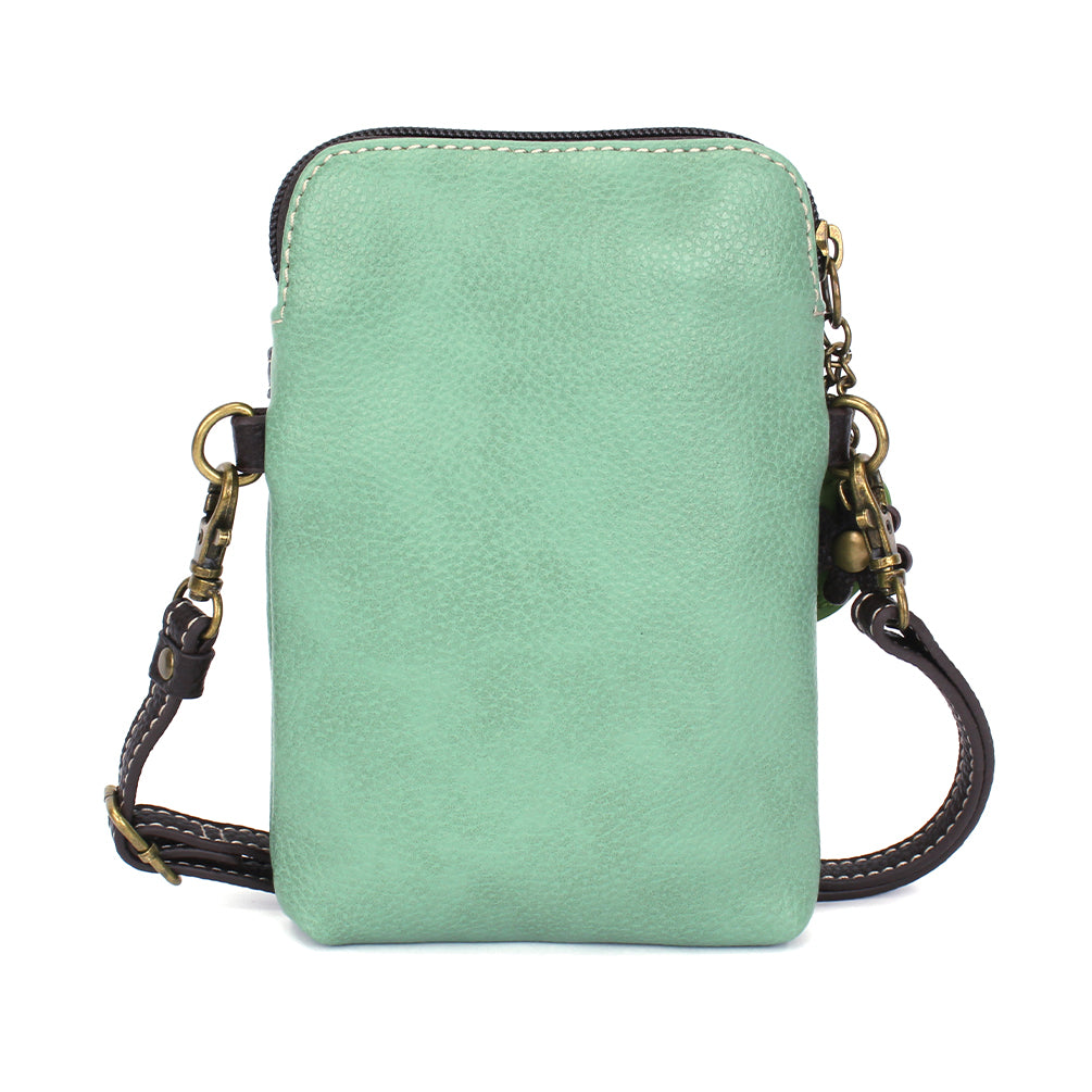 Convenient, Compact, FunSmall front pocket adorned with Ladybug Chala PalAdjustable strap - turn bag into a purse, a crossbody bag, or even a pouch!Top zipper closureDecorative zipper pullExtra padding throughout bag to protect your cell phone3 credit card slots inside2 Adjustable straps that are detachableMaterials: Faux LeatherColor: TealApprox. Measurements: 5"W x 7"H x 1"DStrap adjustable: 7.5"-32"