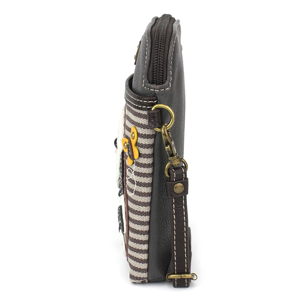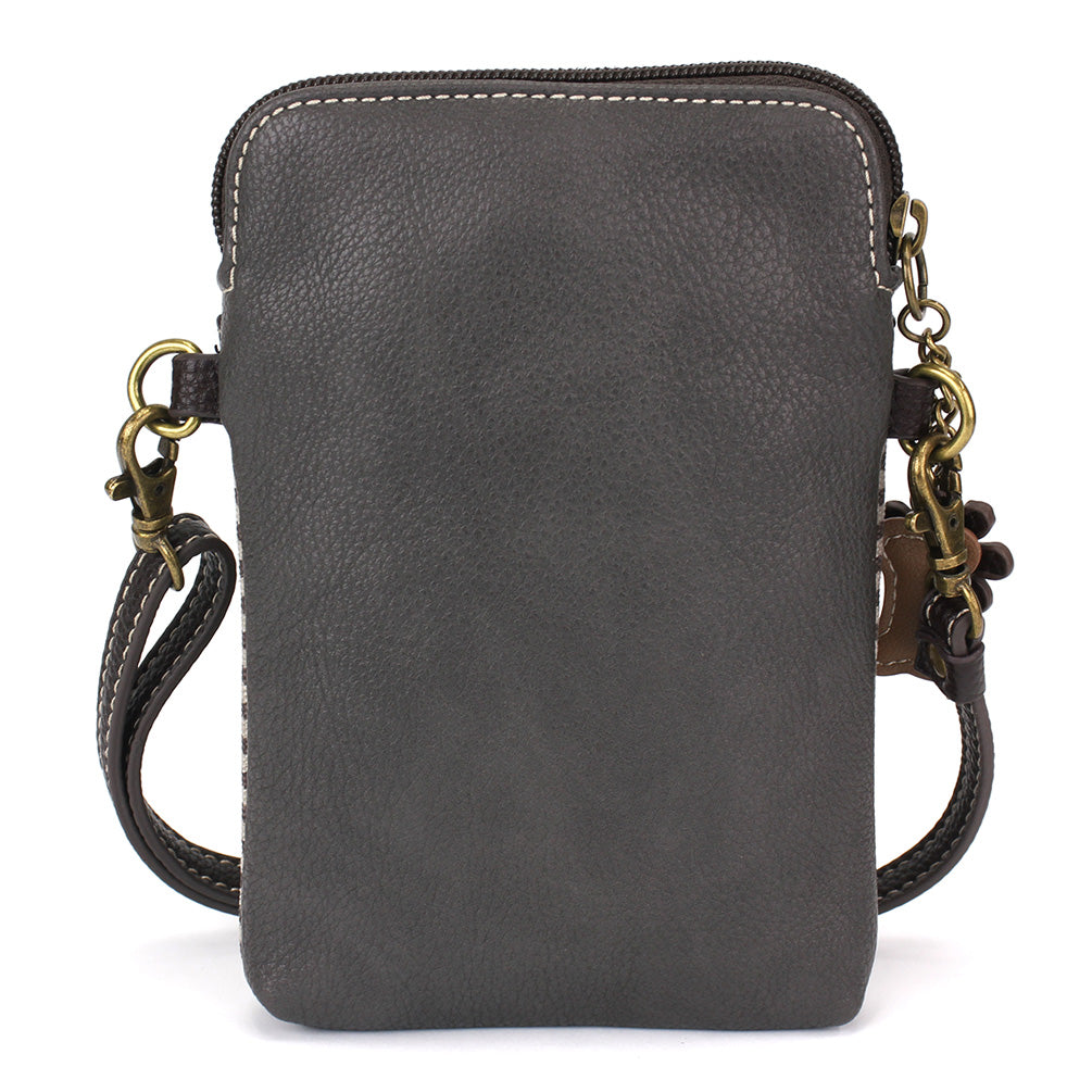 Convenient, Compact, FunSmall front pocket adorned with White Shih Tzu Chala PalAdjustable strap - turn bag into a purse, a crossbody bag, or even a pouch!Top zipper closureDecorative zipper pullExtra padding throughout bag to protect your cell phone3 credit card slots inside2 Adjustable straps that are detachableMaterials: Faux LeatherColor: Gray StripeApprox. Measurements: 5"W x 7"H x 1"DStrap adjustable: 7.5"-32"