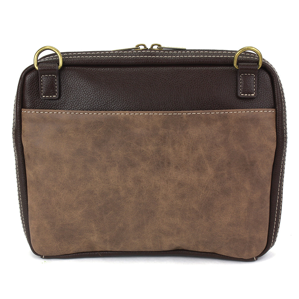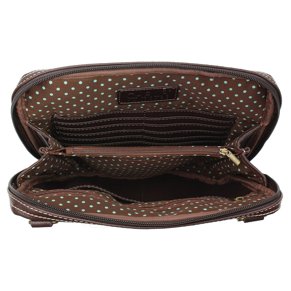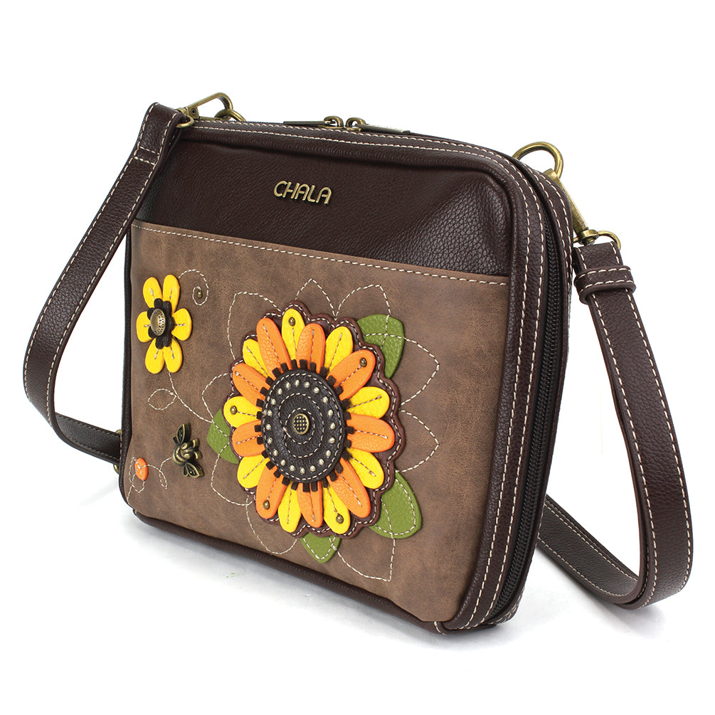 Whimsical, Stylish, FunctionalCarefully crafted and detailed Sunflower Chala Pal designMain zipper pocket has two zippers and opens wide Multiple credit card slotsCompartments for both coins and cashFits small iPads and tabletsInterior slide and zip pockets keep things organizedRear slide pocket for convenience Front zipper pocket for additional storageDistinctive CHALA emblem Antique brass toned hardwareMaterials: Faux LeatherColor: BrownApprox. Measurements: 9.5"W x 8"H x 1.5"DStrap adjustable: 16.5"-31"Designed in California, USAMade in ChinaColors may not be exactly as shown.Lining patterns may vary.