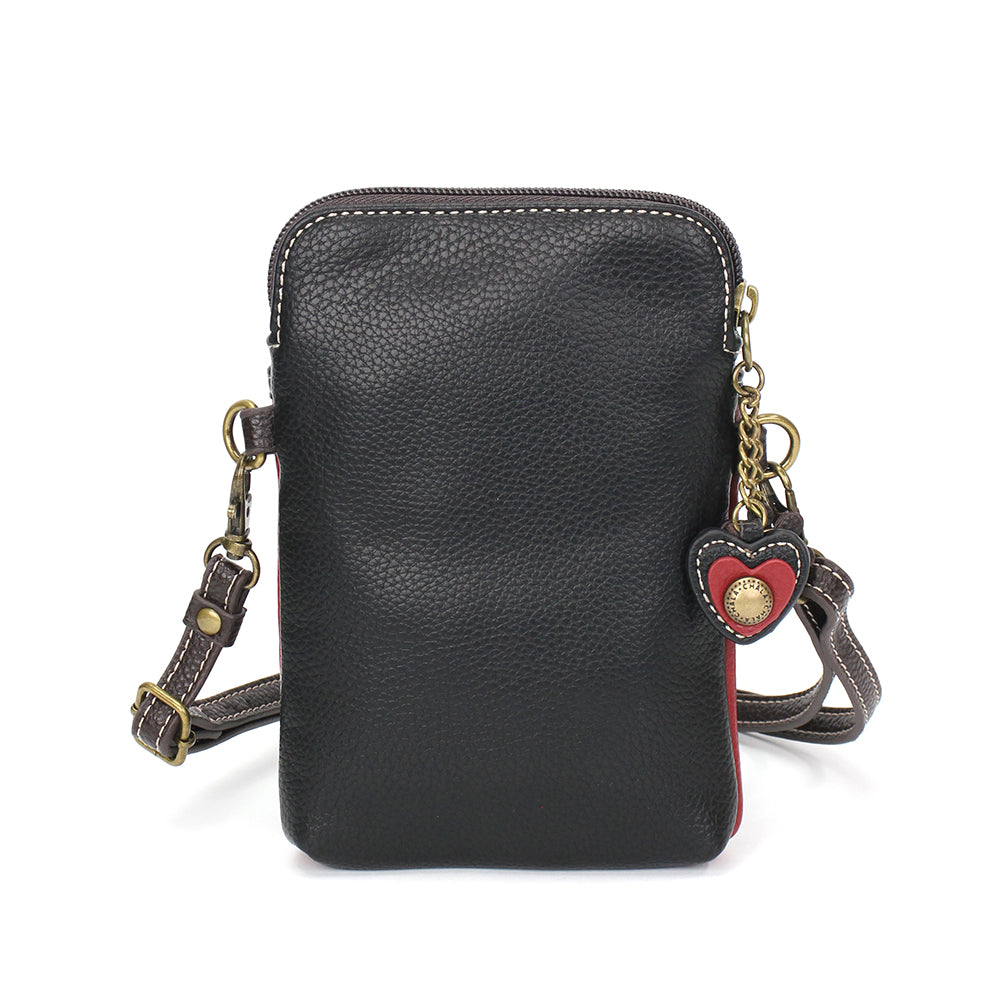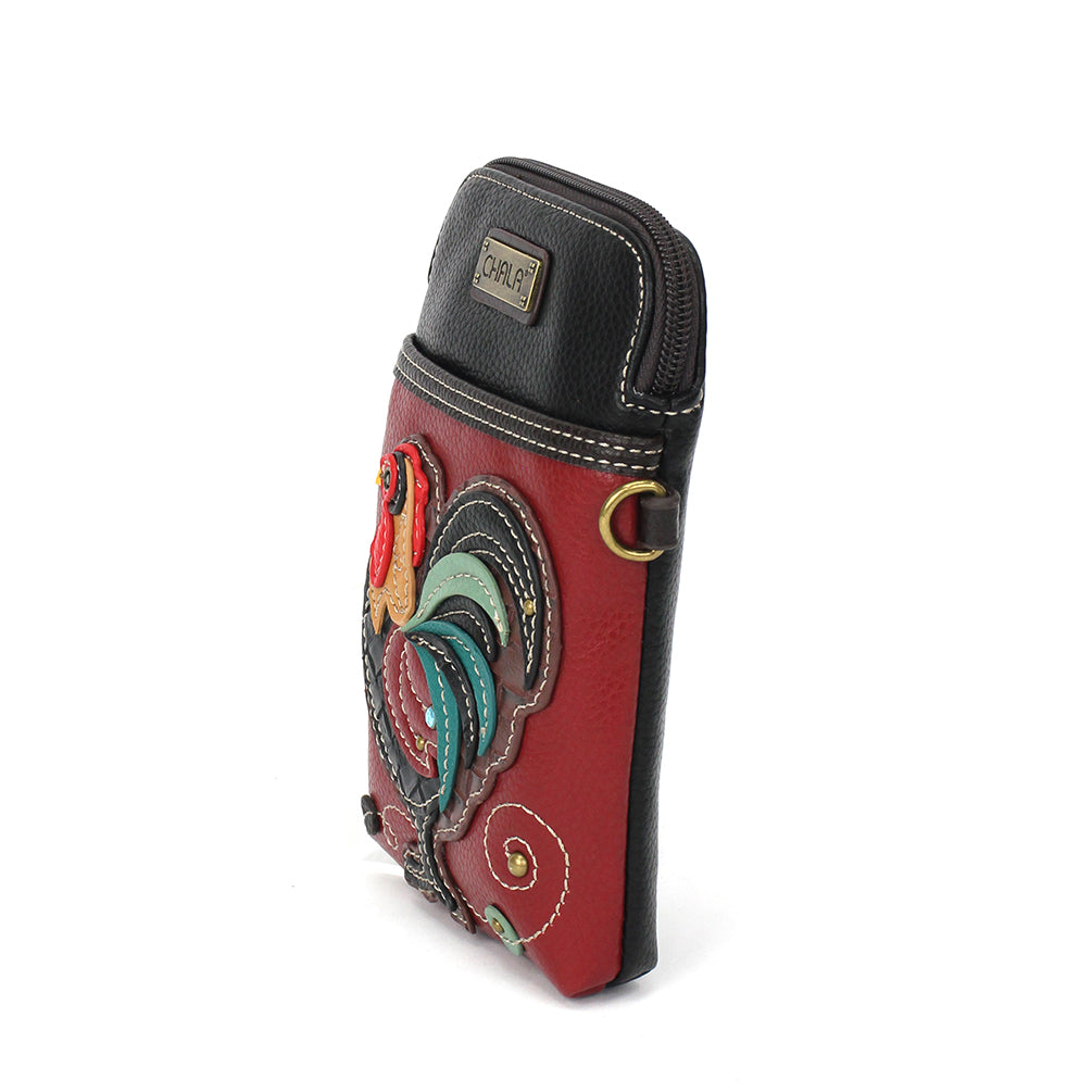 Convenient, Compact, FunSmall front pocket adorned with Rooster Chala PalAdjustable strap - turn bag into a purse, a crossbody bag, or even a pouch!Top zipper closureDecorative zipper pullExtra padding throughout bag to protect your cell phone3 credit card slots inside2 Adjustable straps that are detachableMaterials: Faux LeatherColor: BurgundyApprox. Measurements: 5"W x 7"H x 1"DStrap adjustable: 7.5"-32"