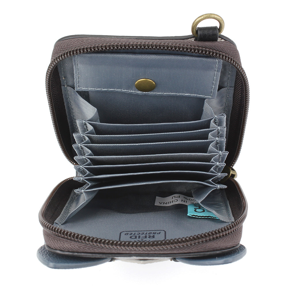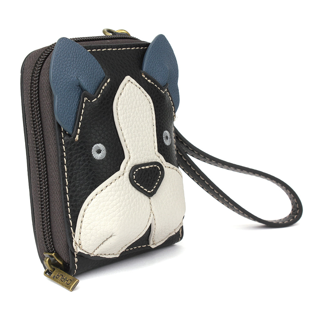 Compact, Playful, and RFID ProtectedThis credit card holder is RFID protected and resembles our Boston Terrier Chala Pal character!Comes with decorative key chain charm and wristletAccordion style organizer for your credit cardsRear slot for photo IDInterior snap closure for coins and cashMaterials: Faux LeatherColor: BlackApprox. Measurements: 3.5"W x 4.5"H x 1"DDesigned in California, USAMade in ChinaColors may not be exactly as shown.