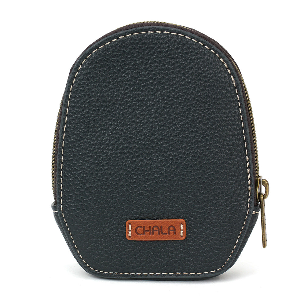 Compact, Convenient, and RFID ProtectedThis coin purse is RFID protected and resembles our Turtle A Chala Pal character!Easily attach to a belt loop or handbag using the spring snap keyringSafely tuck away your key with the keychain ring insideInterior snap closure for coins and cashComes with decorative keychain charmPatterned fabric liningMaterials: Faux LeatherColor: Navy Approx. Measurements: 4""W x 5""H x 0.75""DDesigned in California, USAMade in ChinaColors may not be exactly as shown.Lining patterns may vary.