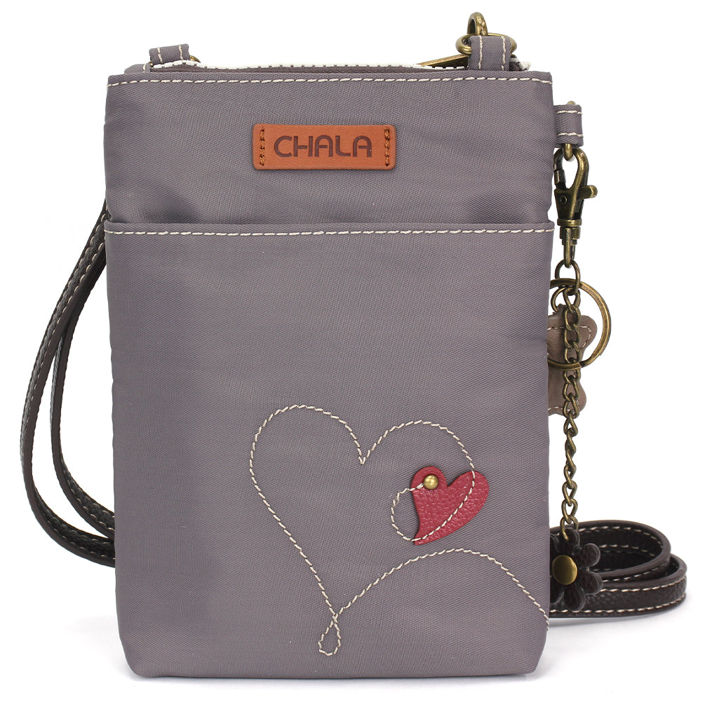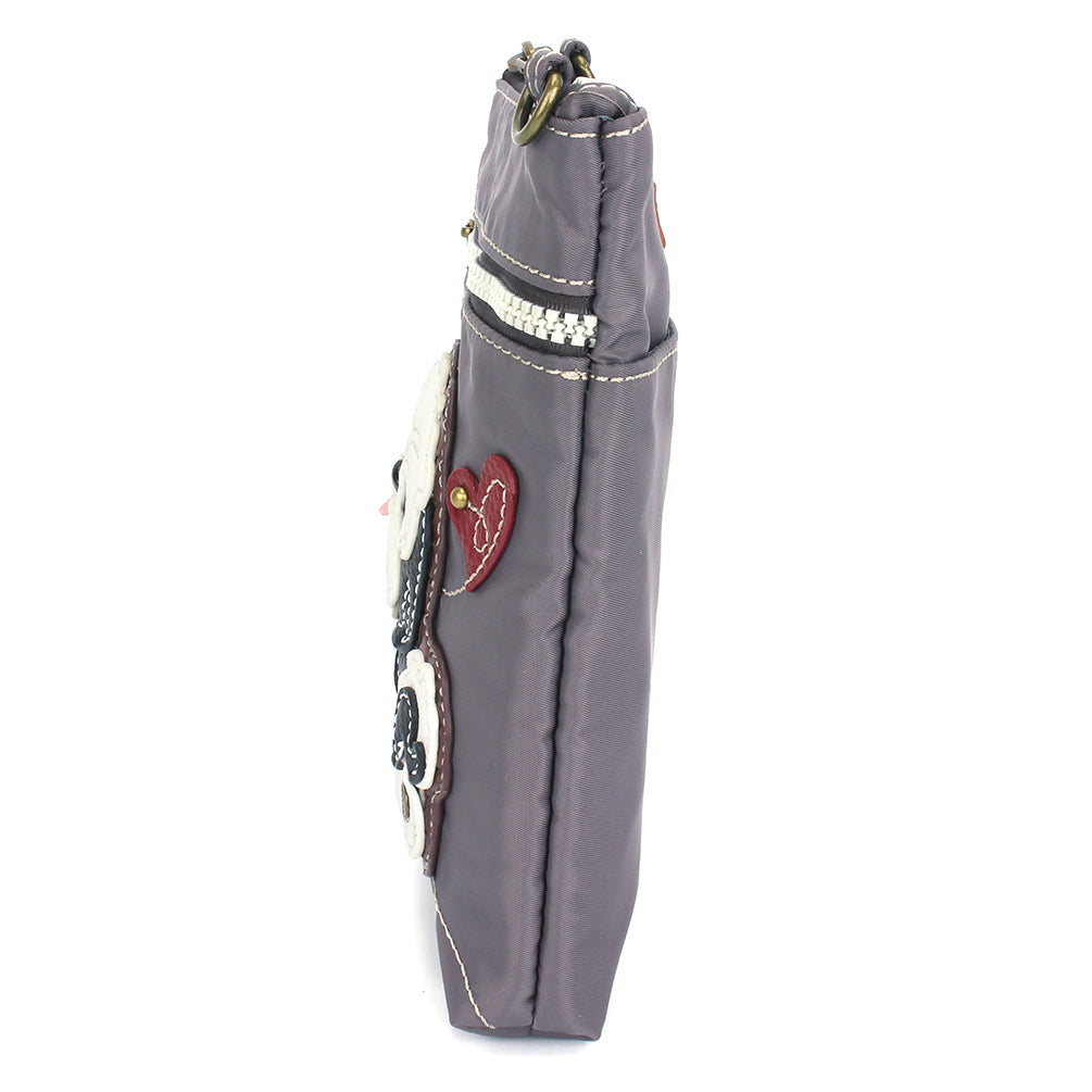 RFID Protected, Simplistic, and LightweightEmbellished with White Shih Tzu Chala Pal designExquisitely detailed embroidery patternsEntire bag is RFID Protected3 interior credit card slotsTop zipper closure and front zipper pocketLarge front pocket to fit your smart phoneAdjustable strap - turn bag into a purse, a crossbody bag, or even a pouch!Detachable key-strap includedAntique brass hardware and CHALA emblemMaterials: Nylon / Faux LeatherColor: GrayApprox. Measurements: 5"W x 7"H x 1"DStrap adjustable: 16.5"-31"Designed in California, USAMade in ChinaColors may not be exactly as shown.
