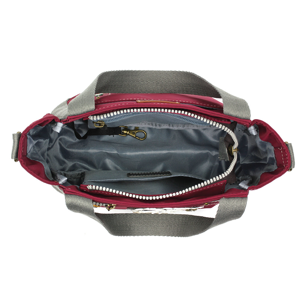 RFID Protected, Versatile, and LightweightAdorned with Westie Chala Pal designAntique brass-toned embellishmentsDual sided design to match any outfit or moodMain compartment is wide enough to double as a whimsical lunch tote! Front zipper pocket Rear slide pocket RFID Protected Credit Card slots(2) Interior pocketsSoft Canvas shoulder strap Detachable crossbody strap also includedMaterials: Nylon/Faux LeatherColor: BurgundyApprox. Measurements: 10.5"W x 8.5"H x 5.5"DHandle Drops: 5.25"Strap adjustable: 15.5"- 31"Designed in California, USAMade in ChinaColors may not be exactly as shown.