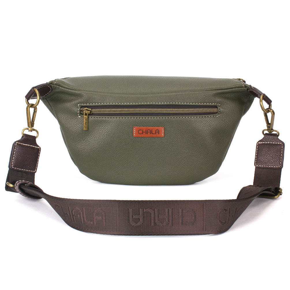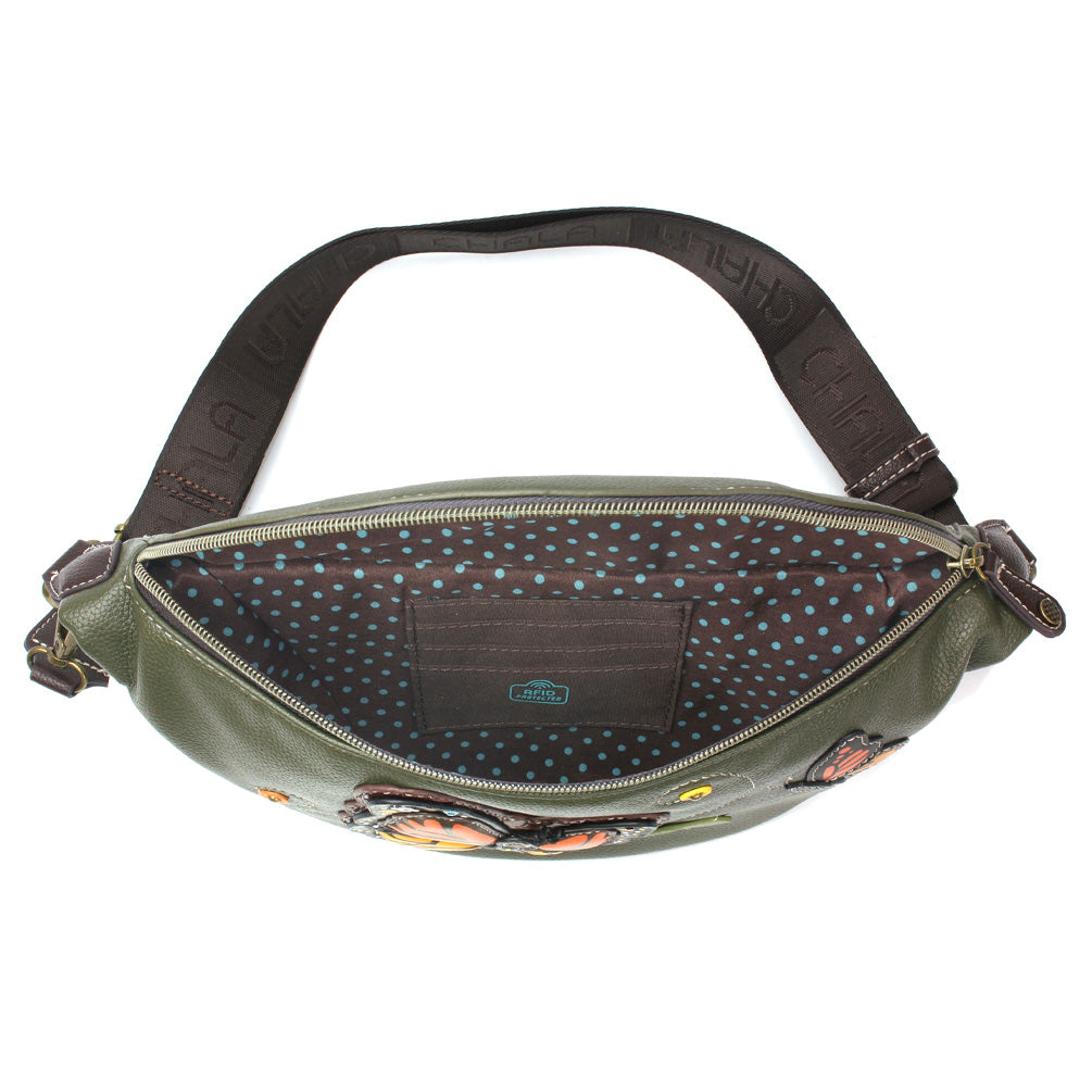 Trendy, Versatile, and RFID ProtectedFront is adorned with our Monarch Butterfly Chala Pal character!Convertible 3 ways - fanny pack, sling bag, crossbodyRFID protected CC slotsZipper pocket in the back easily fits your phone2 straps included to convert the bagPatterned fabric liningMaterials: Faux LeatherColor: Olive Approx. Measurements: 10.5"W x 5.5"H x 1.5"DStrap Adjustable: 19.5"-43"Designed in California, USAMade in ChinaColors may not be exactly as shown.Lining patterns may vary.