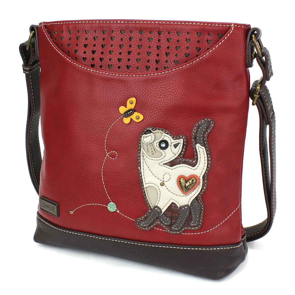 Unique, Chic, FunAdorned with Slim Cat Chala designStunning embroidery patterns and embellishmentsFront slide pocketZippered main pocketRear slide pocketMaterials: Faux LeatherColor: BurgundyApprox. Measurements: 9.5"W x 10.5"H x 3"DStrap adjustable: 15"-30"Designed in California, USAMade in ChinaColors may not be exactly as shown.Lining patterns may vary.