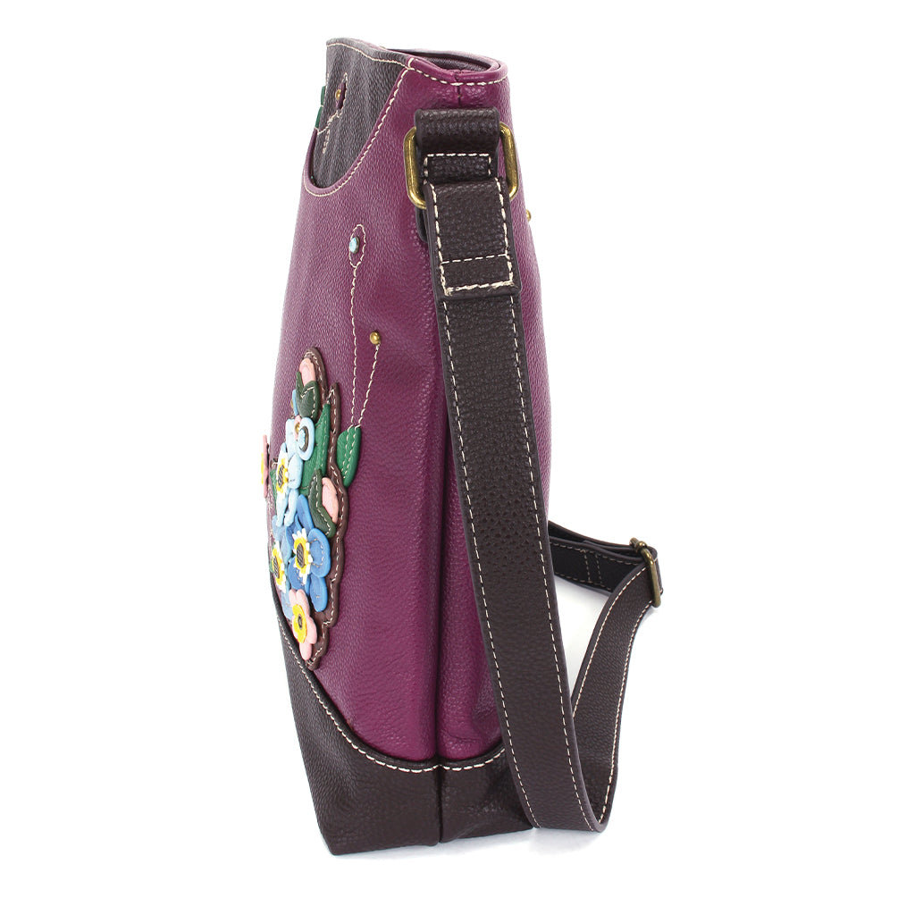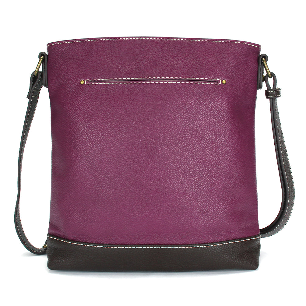 Unique, Chic, FunAdorned with Forget Me Not Chala designStunning embroidery patterns and embellishmentsFront slide pocketZippered main pocketRear slide pocketMaterials: Faux LeatherColor: PurpleApprox. Measurements: 9.5"W x 10.5"H x 3"DStrap adjustable: 15"-30"Designed in California, USAMade in ChinaColors may not be exactly as shown.Lining patterns may vary.