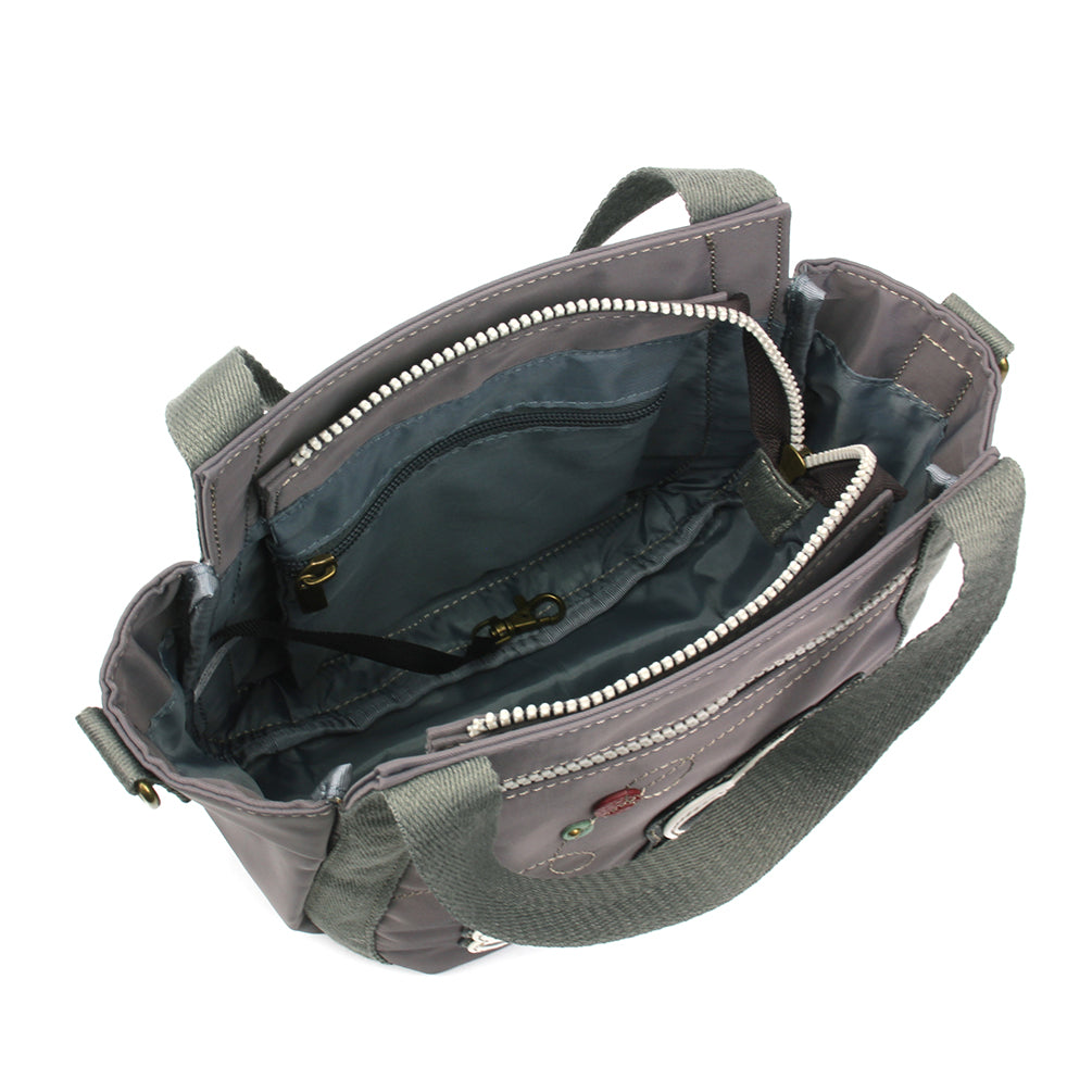 RFID Protected, Versatile, and LightweightAdorned with Pawprint Chala Pal designAntique brass-toned embellishmentsDual sided design to match any outfit or moodMain compartment is wide enough to double as a whimsical lunch tote! Front zipper pocket Rear slide pocket RFID Protected Credit Card slots(2) Interior pocketsSoft Canvas shoulder strap Detachable crossbody strap also includedMaterials: Nylon/Faux LeatherColor: GrayApprox. Measurements: 10.5"W x 8.5"H x 5.5"DHandle Drops: 5.25"Strap adjustable: 15.5"- 31"Designed in California, USAMade in ChinaColors may not be exactly as shown.