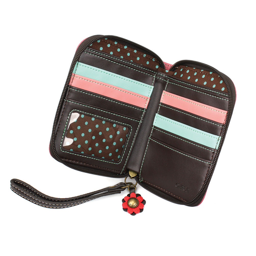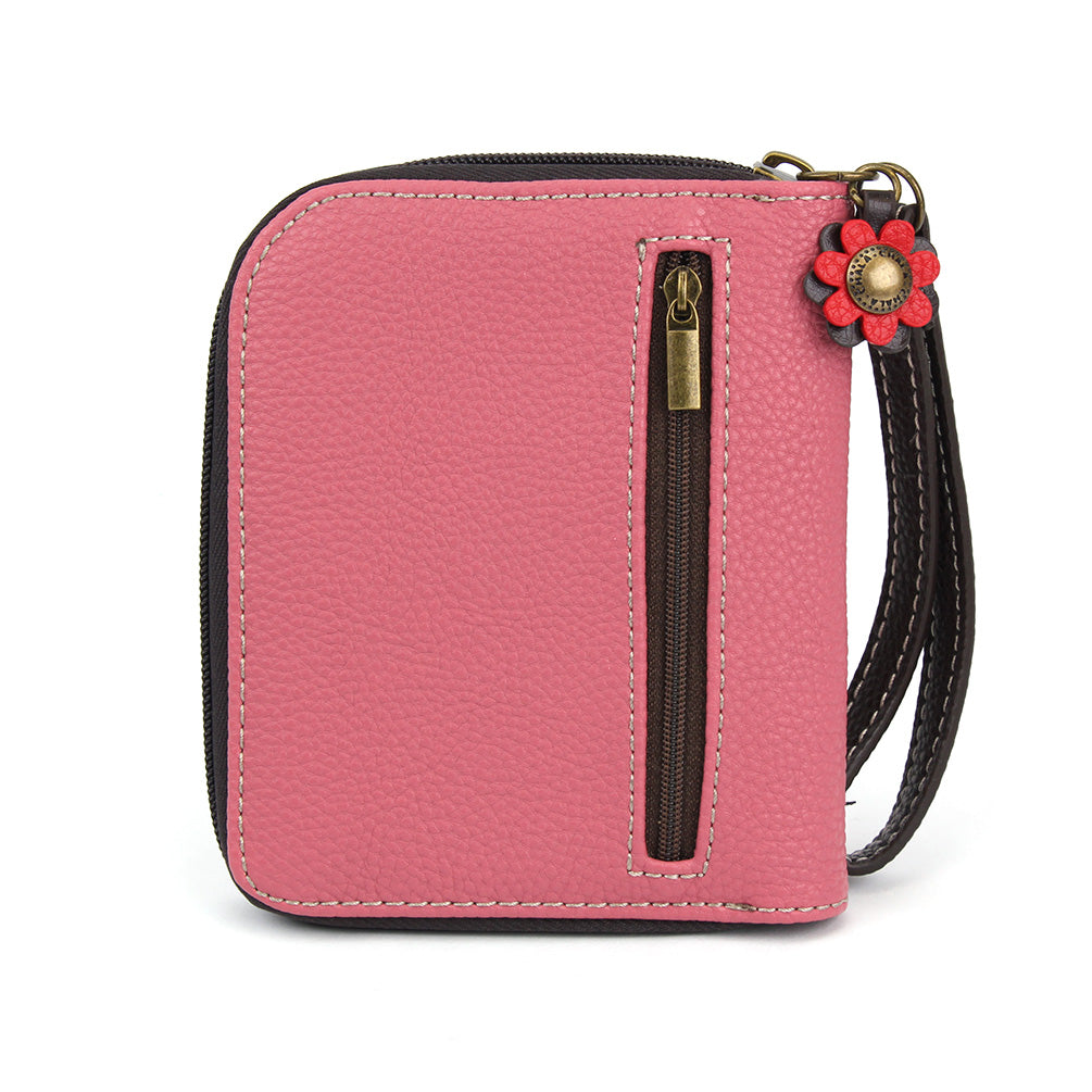 Stylish, Fun, FunctionalThe front is adorned with our New Butterfly Chala Pal design!Comes with a decorative zipper pull charmLots of slots for your cards and cashOne clear slot for photo IDBack zipper pocket for coins and other small itemsMaterials: Faux LeatherColor: PinkApprox. Measurements: 4.5"W x 5.5"H x 1"DDesigned in California, USAMade in ChinaColors may not be exactly as shown.Lining patterns may vary.