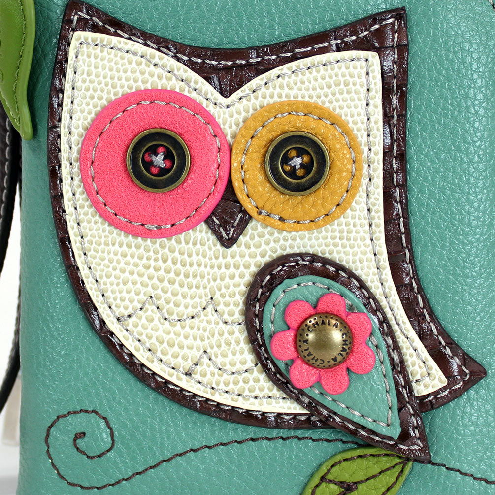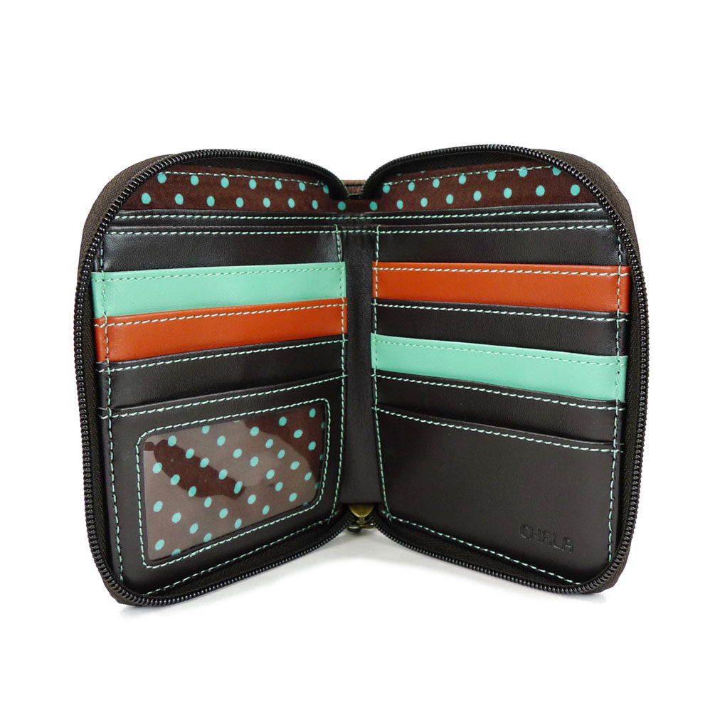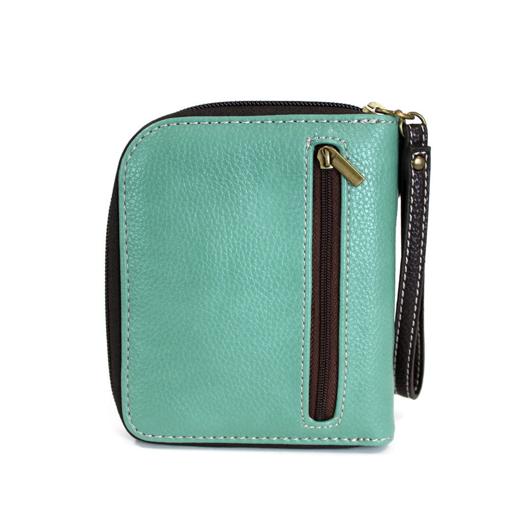 Stylish, Fun, FunctionalThe front is adorned with our Owl II Chala Pal design!Comes with a decorative zipper pull charmLots of slots for your cards and cashOne clear slot for photo IDBack zipper pocket for coins and other small itemsMaterials: Faux LeatherColor: TealApprox. Measurements: 4.5"W x 5.5"H x 1"DDesigned in California, USAMade in ChinaColors may not be exactly as shown.Lining patterns may vary.