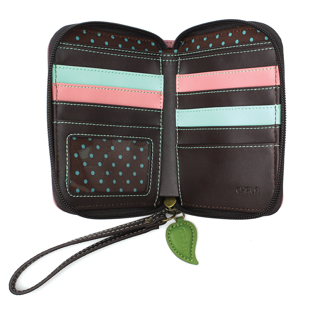 Stylish, Fun, FunctionalThe front is adorned with our Rose Chala Pal design!Comes with a decorative zipper pull charmLots of slots for your cards and cashOne clear slot for photo IDBack zipper pocket for coins and other small itemsMaterials: Faux LeatherColor: PinkApprox. Measurements: 4.5"W x 5.5"H x 1"DDesigned in California, USAMade in ChinaColors may not be exactly as shown.Lining patterns may vary.