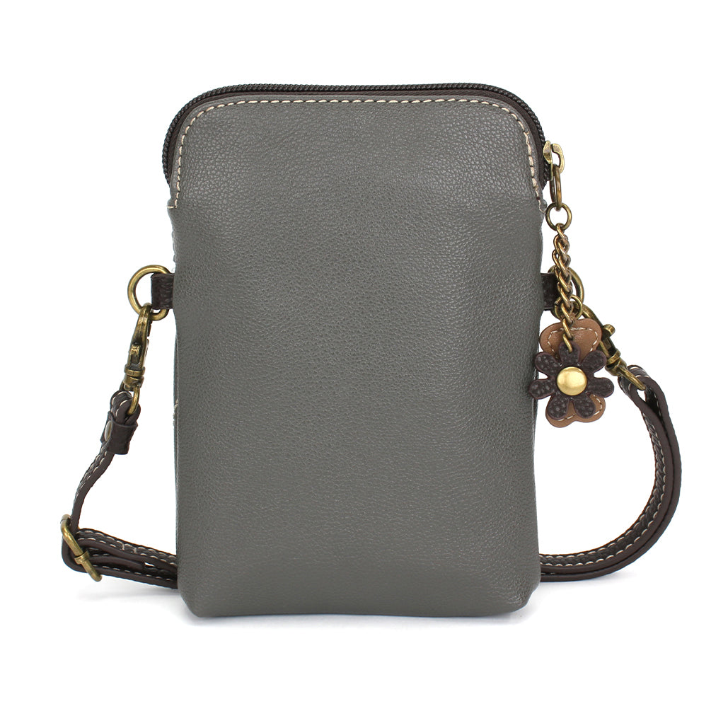 Convenient, Compact, FunSmall front pocket adorned with B&W Pawprint Chala PalAdjustable strap - turn bag into a purse, a crossbody bag, or even a pouch!Top zipper closureDecorative zipper pullExtra padding throughout bag to protect your cell phone3 credit card slots inside2 Adjustable straps that are detachableMaterials: Faux LeatherColor: GrayApprox. Measurements: 5"W x 7"H x 1"DStrap adjustable: 7.5"-32"