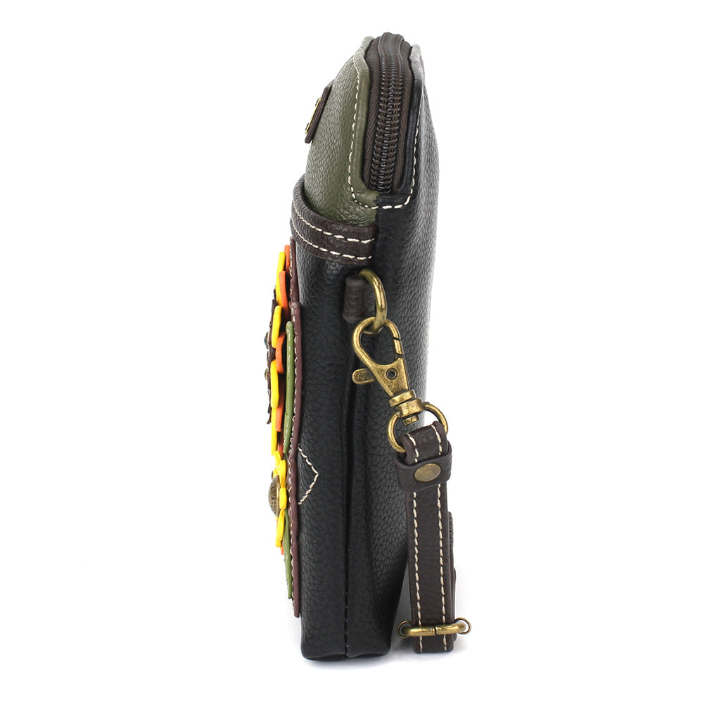 Convenient, Compact, FunSmall front pocket adorned with Sunflower Group Chala PalAdjustable strap - turn bag into a purse, a crossbody bag, or even a pouch!Top zipper closureDecorative zipper pullExtra padding throughout bag to protect your cell phone3 credit card slots inside2 Adjustable straps that are detachableMaterials: Faux LeatherColor: BlackApprox. Measurements: 5"W x 7"H x 1"DStrap adjustable: 7.5"-32"