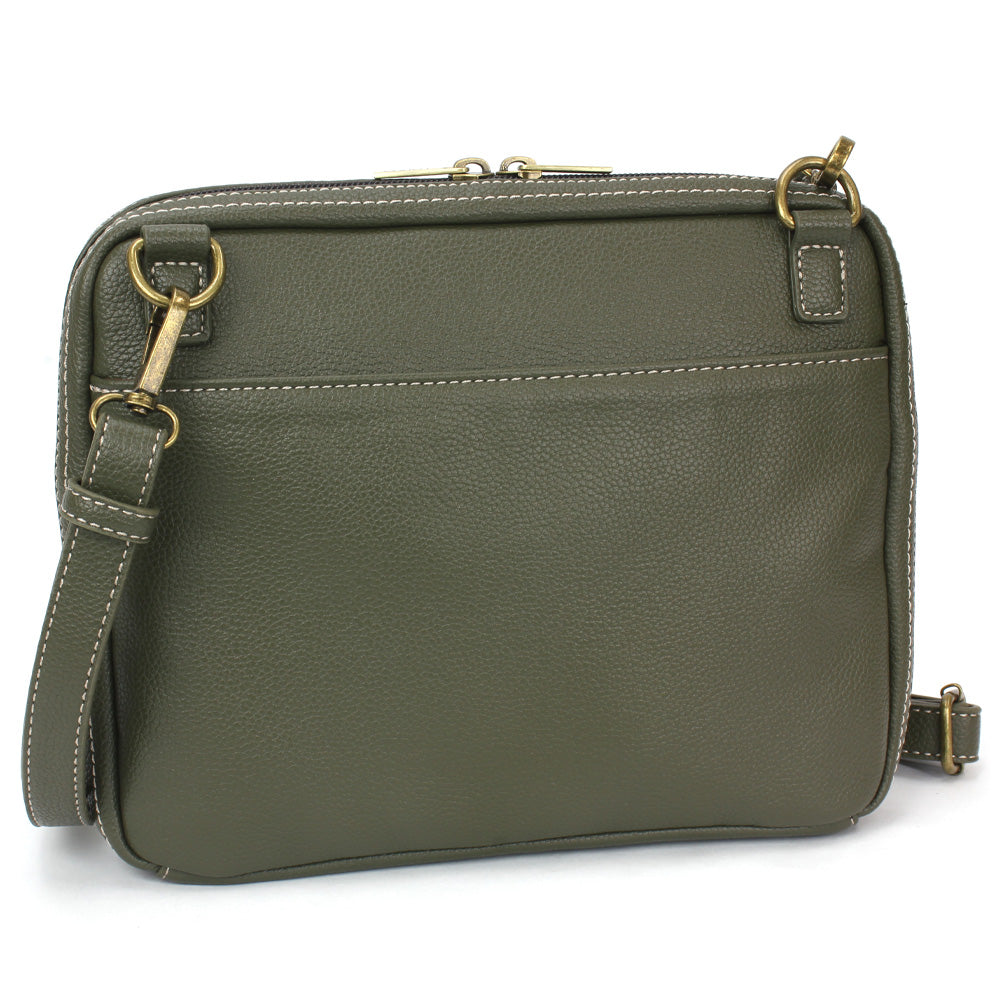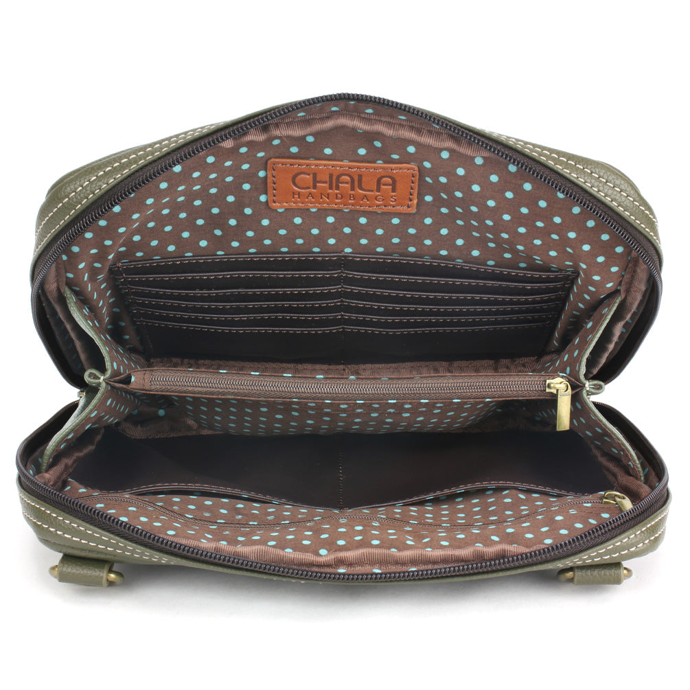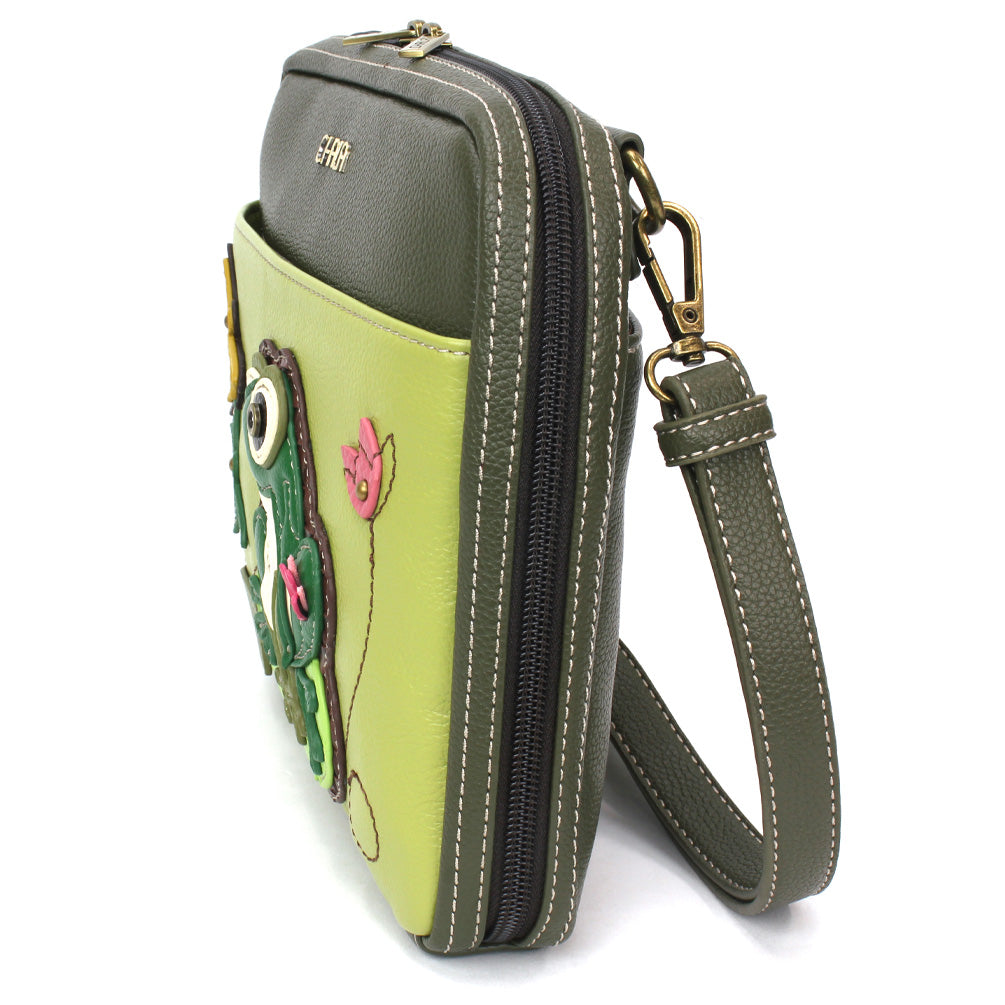 Whimsical, Stylish, FunctionalCarefully crafted and detailed Frog A Chala Pal designMain zipper pocket has two zippers and opens wide Multiple credit card slotsCompartments for both coins and cashFits small iPads and tabletsInterior slide and zip pockets keep things organizedRear slide pocket for convenience Front zipper pocket for additional storageDistinctive CHALA emblem Antique brass toned hardwareMaterials: Faux LeatherColor: Green Approx. Measurements: 9.5"W x 8"H x 1.5"DStrap adjustable: 16.5"-31"Designed in California, USAMade in ChinaColors may not be exactly as shown.Lining patterns may vary.