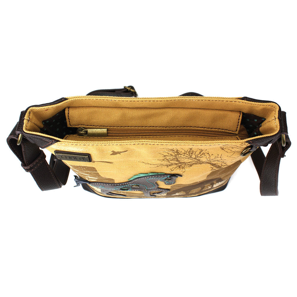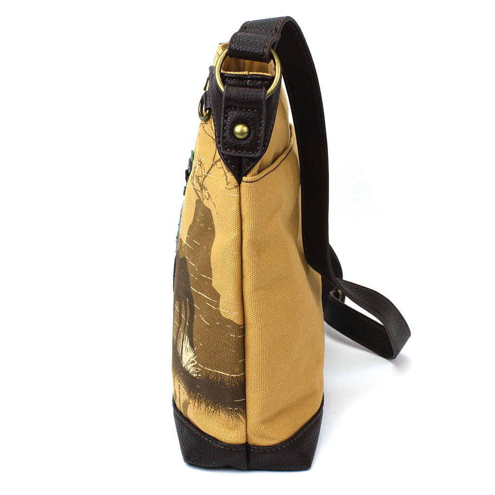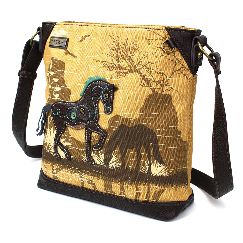 Stylish, Compact, VersatileCanvas printed background with Horse characterCharacter with detailed stitching and button eyeAdjustable shoulder strapTop zip closureRear pocket with zipper closurePatterned fabric lining with slide and zipper pocketsFeatures antique, brass toned hardwareMaterials: Canvas / Faux LeatherColor: BrownApprox. Measurements: 10"W x 10.5"H x 3.25"DStrap adjustable: 14.5"-28"Designed in California, USA Made in China Colors may not be exactly as shown. Lining patterns may vary.