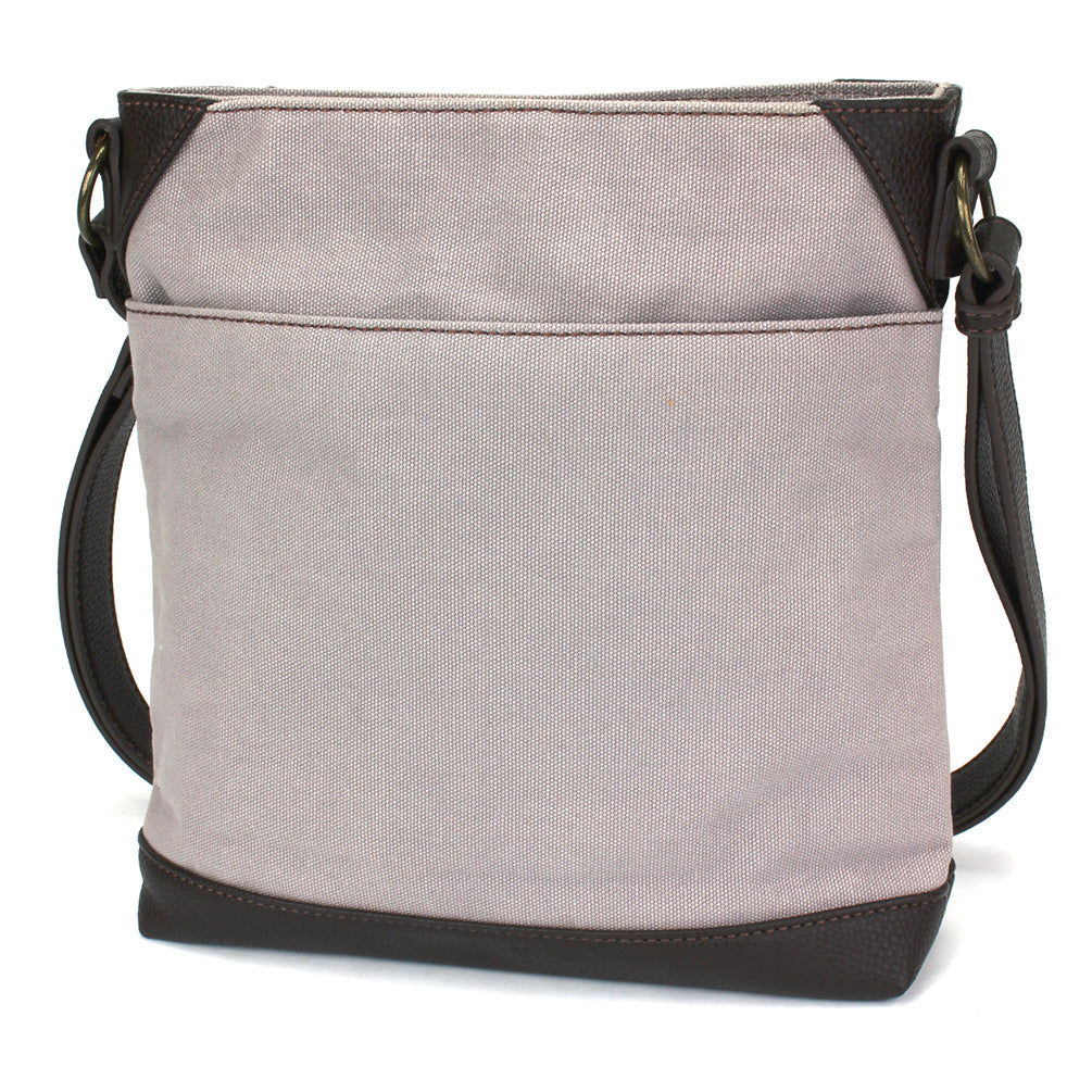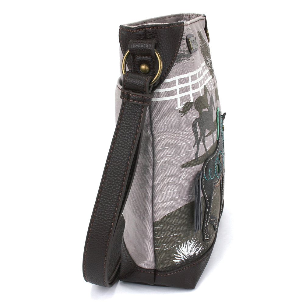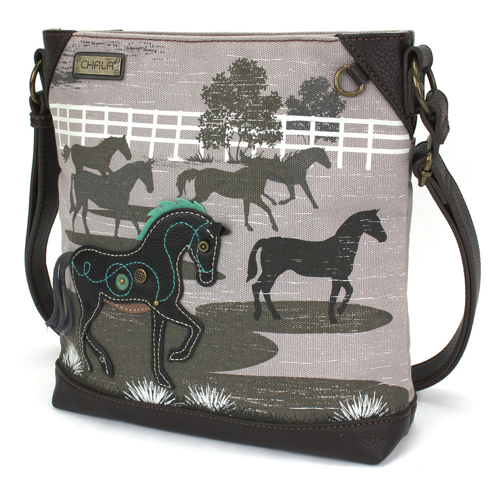 Stylish, Compact, VersatileCanvas printed background with Horse characterCharacter with detailed stitching and button eyeAdjustable shoulder strapTop zip closureRear pocket with zipper closurePatterned fabric lining with slide and zipper pocketsFeatures antique, brass toned hardwareMaterials: Canvas / Faux LeatherColor: GrayApprox. Measurements: 10"W x 10.5"H x 3.25"DStrap adjustable: 14.5"-28"Designed in California, USA Made in China Colors may not be exactly as shown. Lining patterns may vary.