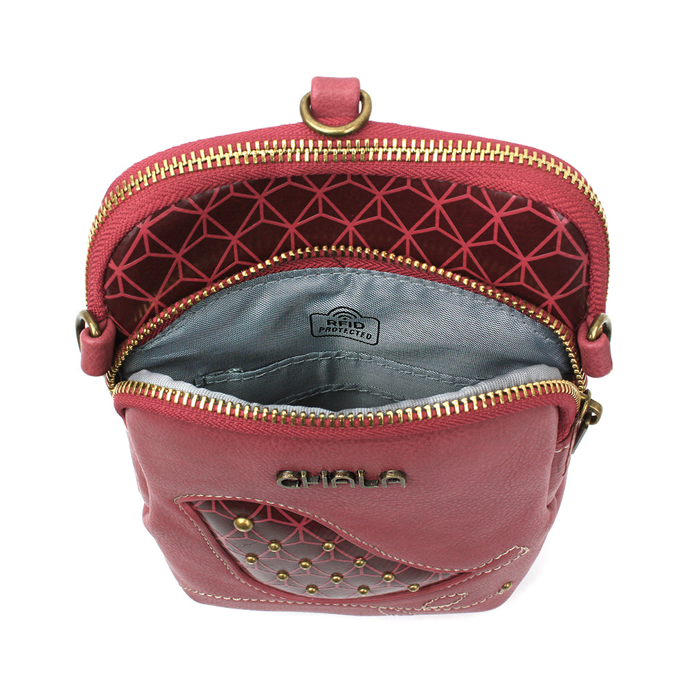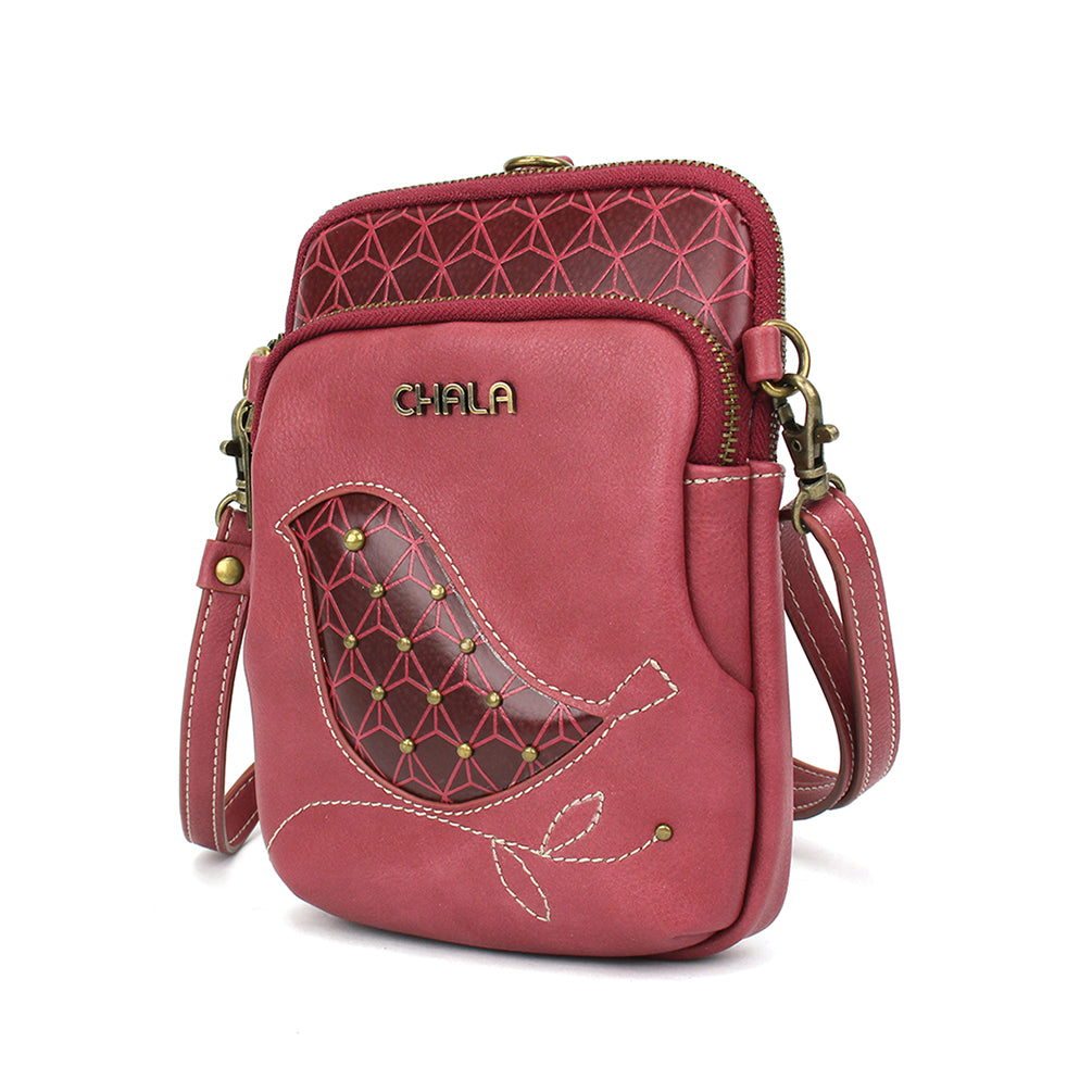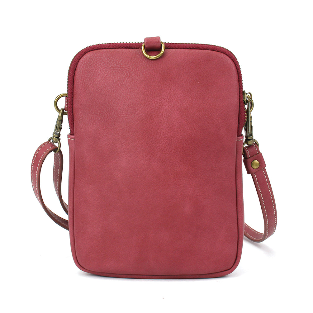 Unique, Sophisticated, FunSmall front pocket adorned with Bird Chala designVersatile straps - wearable many ways!Two zipper pocketsRFID Protected lining in front pocket3 interior credit card slotsAntique brass toned hardwareNew and improved size with sophisticated design patternsMaterials: Faux LeatherColor: BerryApprox. Measurements: 5.5"W x 7.5"H x 2"DStrap adjustable: 14"-30"Designed in California, USA Made in ChinaColors may not be exactly as shown.