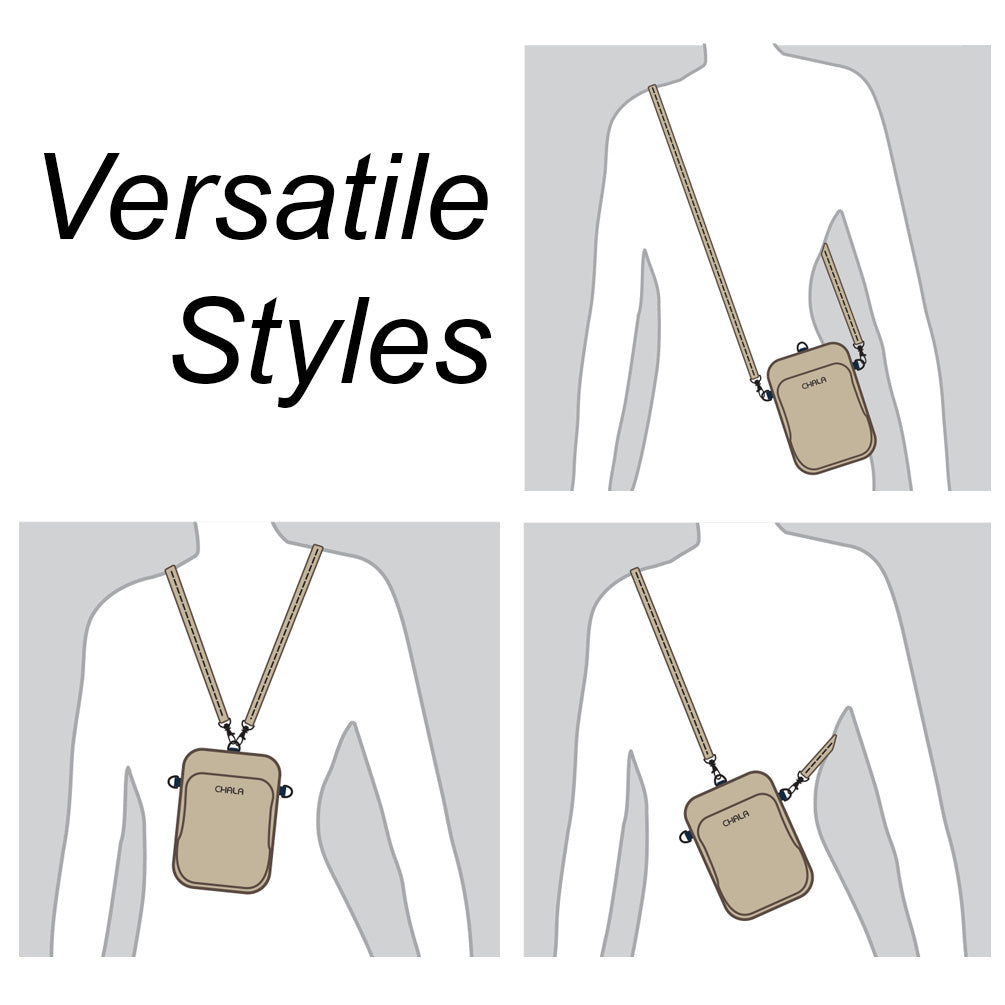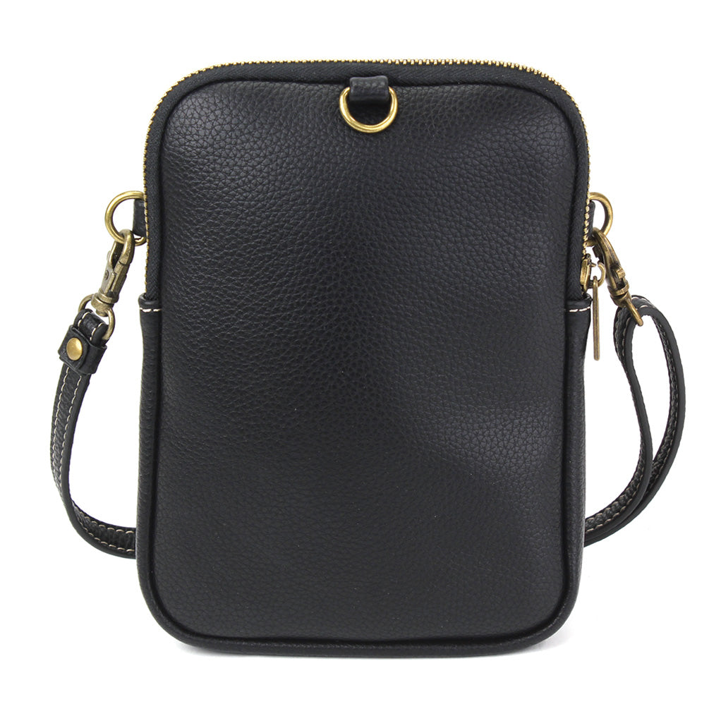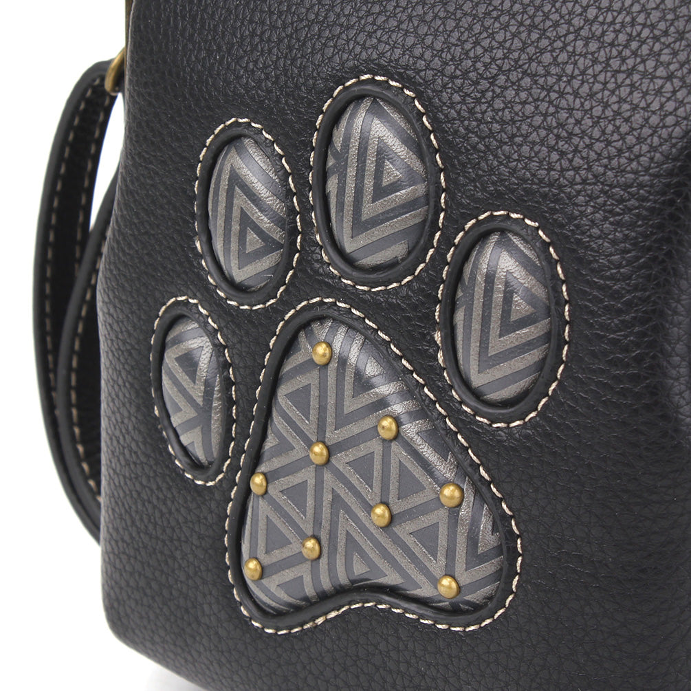 Unique, Sophisticated, FunSmall front pocket adorned with Pawprint Chala designVersatile straps - wearable many ways!Two zipper pocketsRFID Protected lining in front pocket3 interior credit card slotsAntique brass toned hardwareNew and improved size with sophisticated design patternsMaterials: Faux LeatherColor: BlackApprox. Measurements: 5.5"W x 7.5"H x 2"DStrap adjustable: 14"-30"Designed in California, USA Made in ChinaColors may not be exactly as shown.