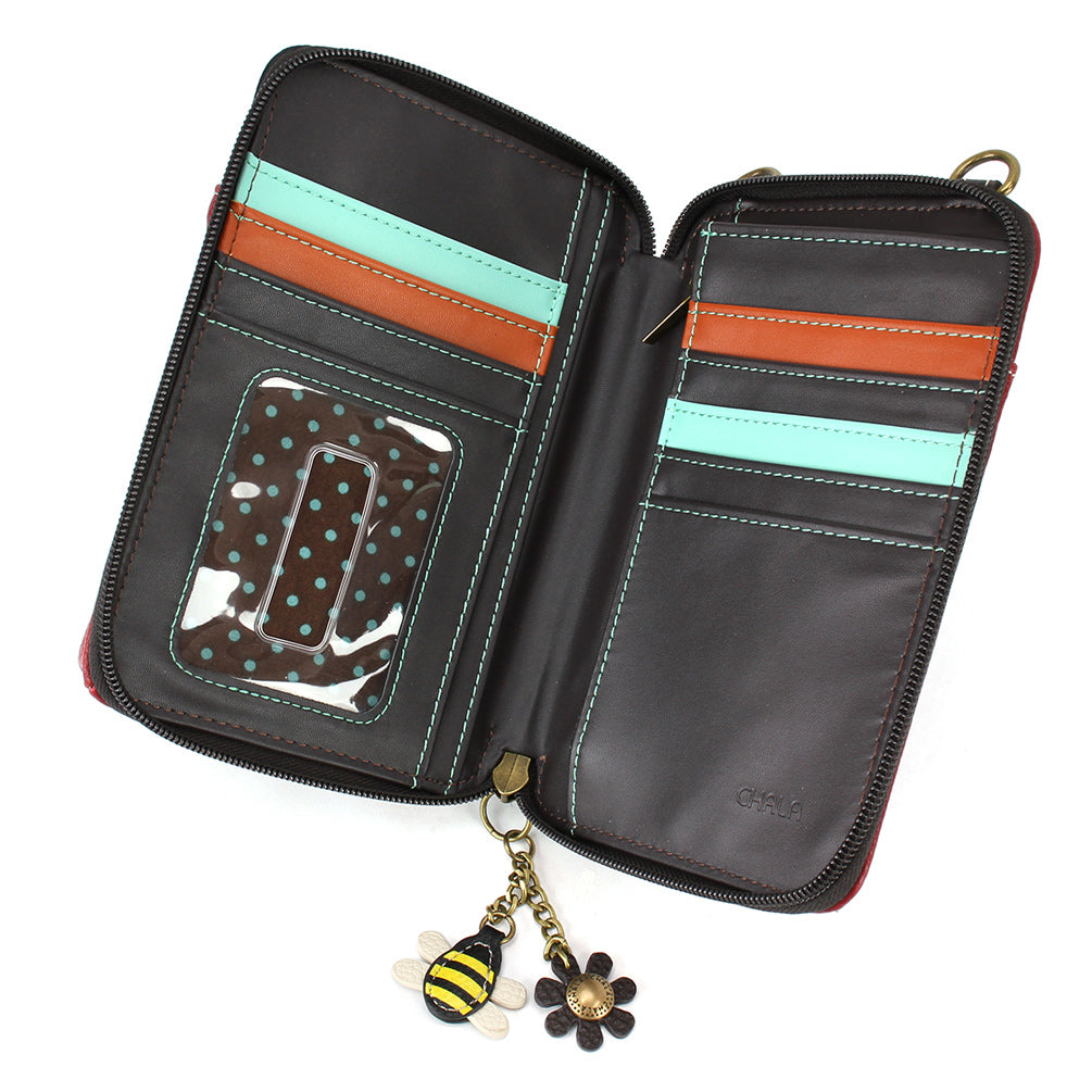 Efficient, Compact, Easy-To-CarryExquisite Black Bear Chala Pal adorns the frontFront slide pocket fits smart phonesRear slide pocketZipper pull is a decorative charmZips open for large walletLots of slots, ID window, and zip pocket for coins2 straps includedConvertible straps make it a pouch, purse, or crossbodyMaterials: Faux LeatherColor: Burgundy Approx. Measurements: 4.5"W x 7"H x 1.5"DStrap adjustable: 7.5"-31"Designed in California, USAMade in ChinaColors may not be exactly as shown.Lining patterns may vary.